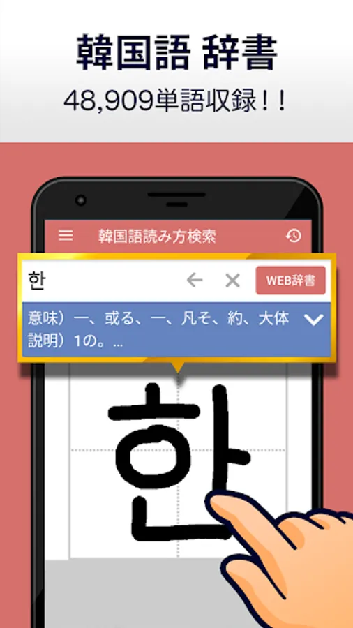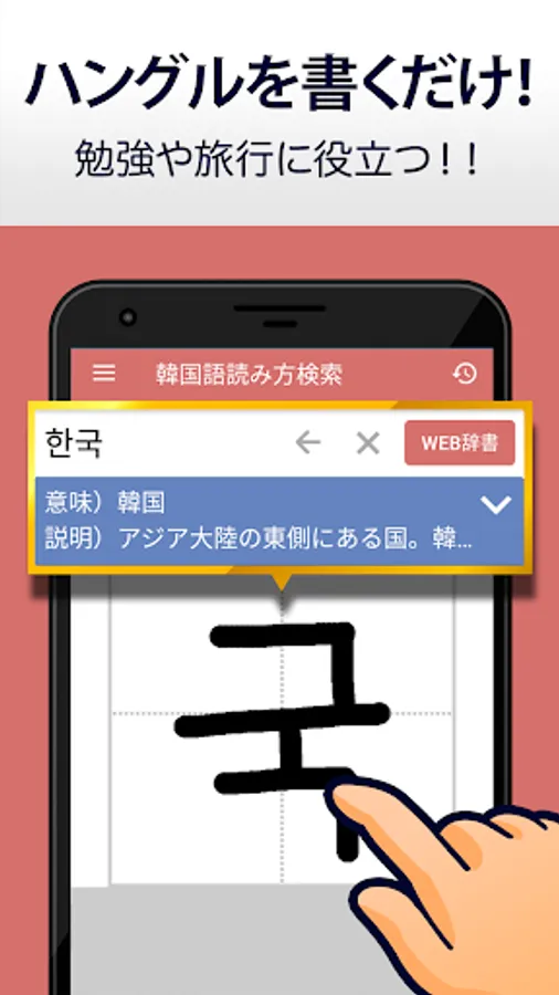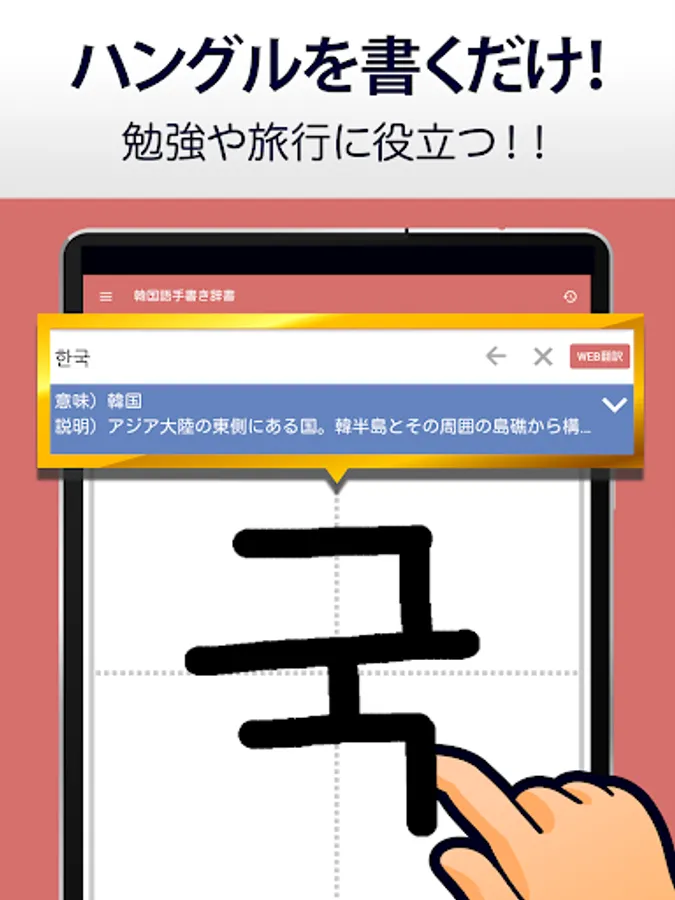 It is a convenient Korean dictionary and translation app that allows you to handwrite Korean (Hangul characters) and look up the meaning in Japanese.
