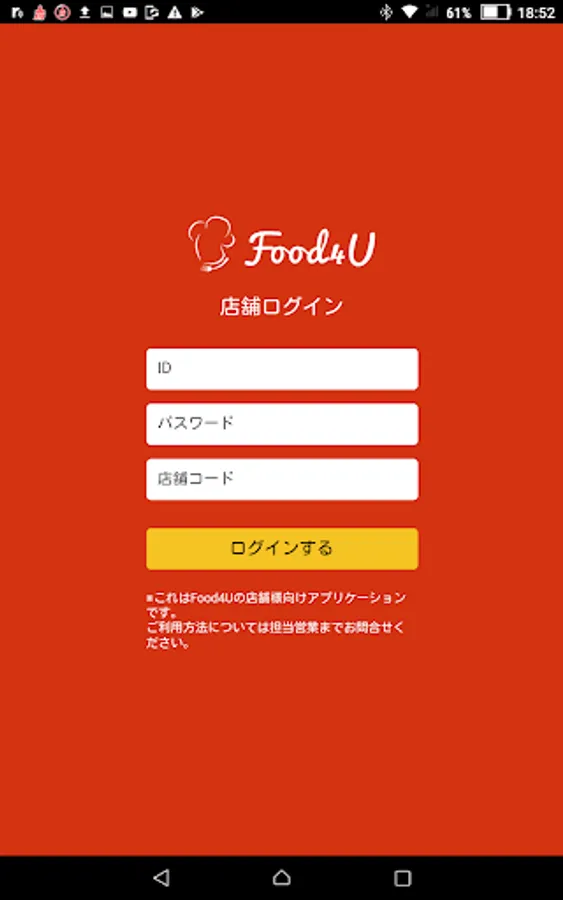 It is an application to use Food4U at a contracted store. A notification will be sent to the app when an order is placed. You can also check the order list and details using the app.