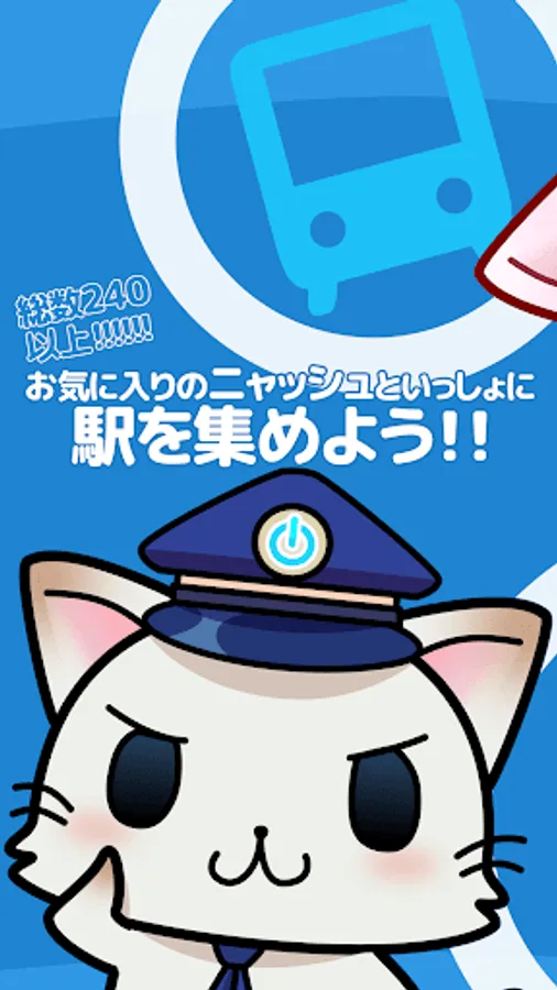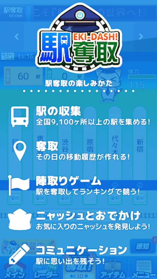 In cooperation with the cat-shaped robot "Nash" dispatched by the Retrieval Association, you will depart on a journey of all-Japan railroads to capture stations while making full use of location information and items! !