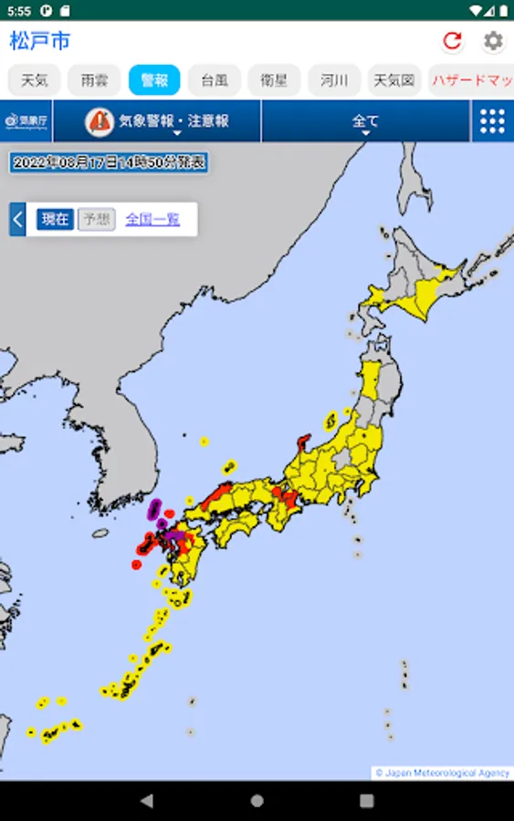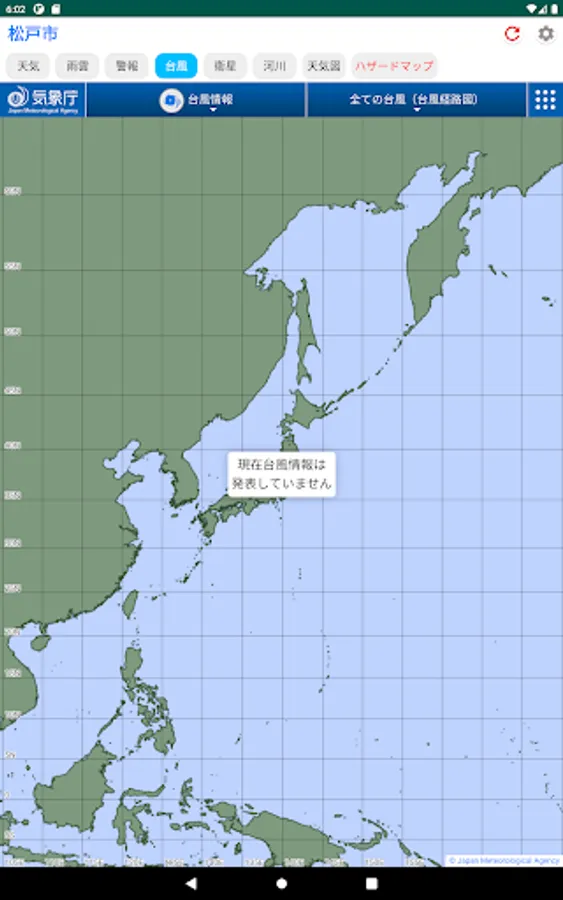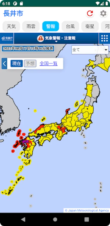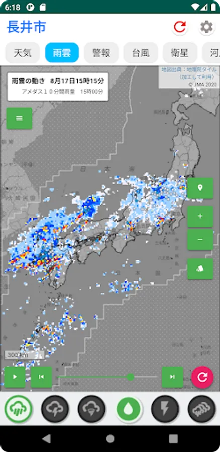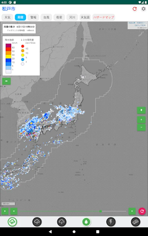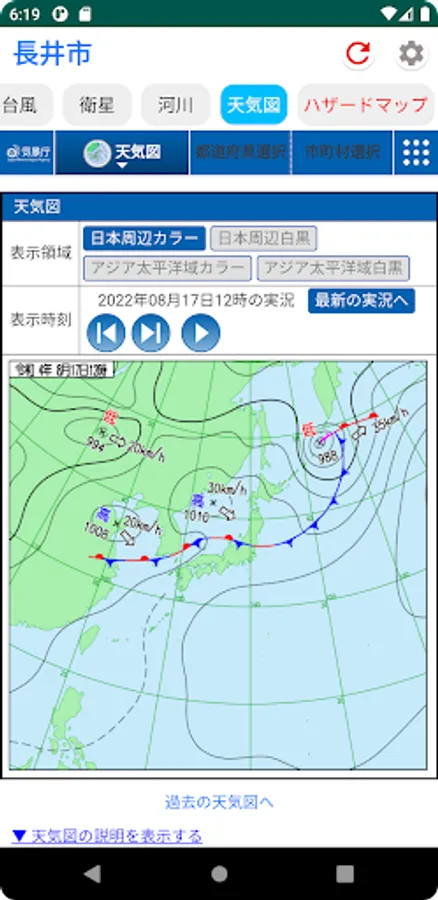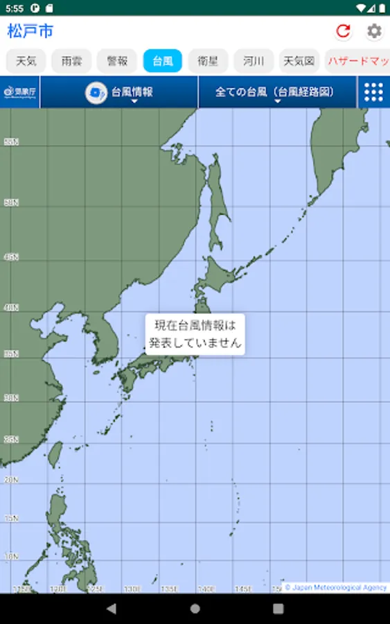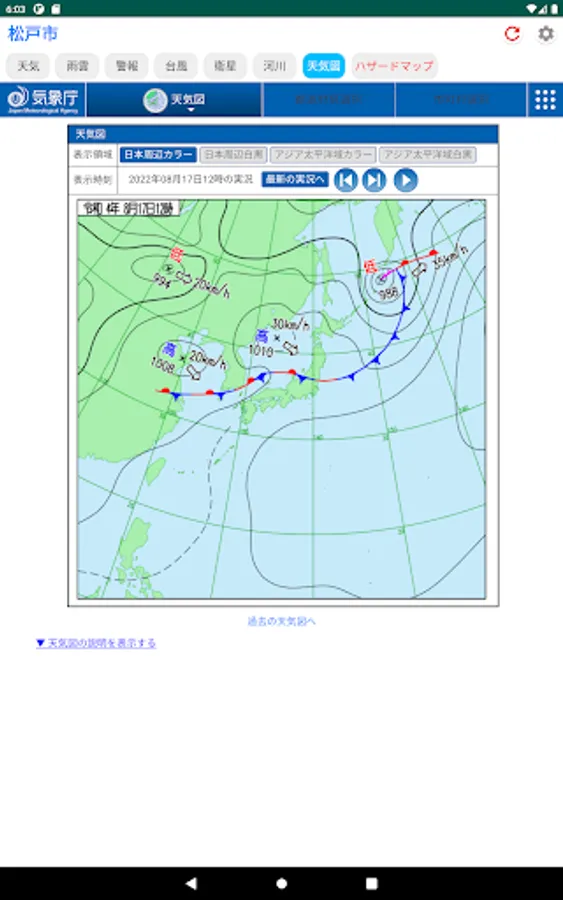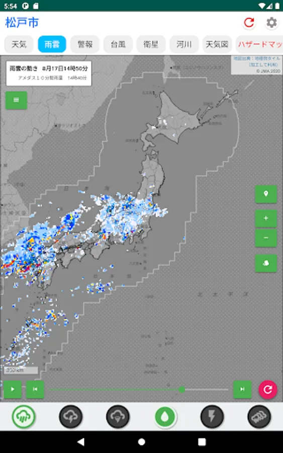 The weather forecast data of the Japan Meteorological Agency has been laid out independently. Also, you can switch to rain cloud, warning, typhoon, and river information by tapping any of the buttons at the top of the screen. Ads are shown, but as little as possible.