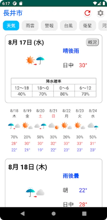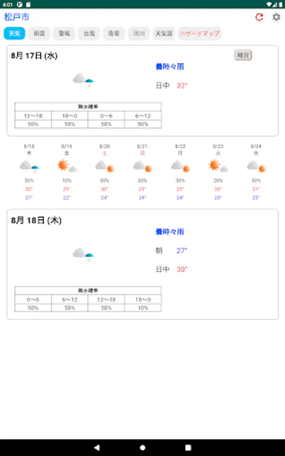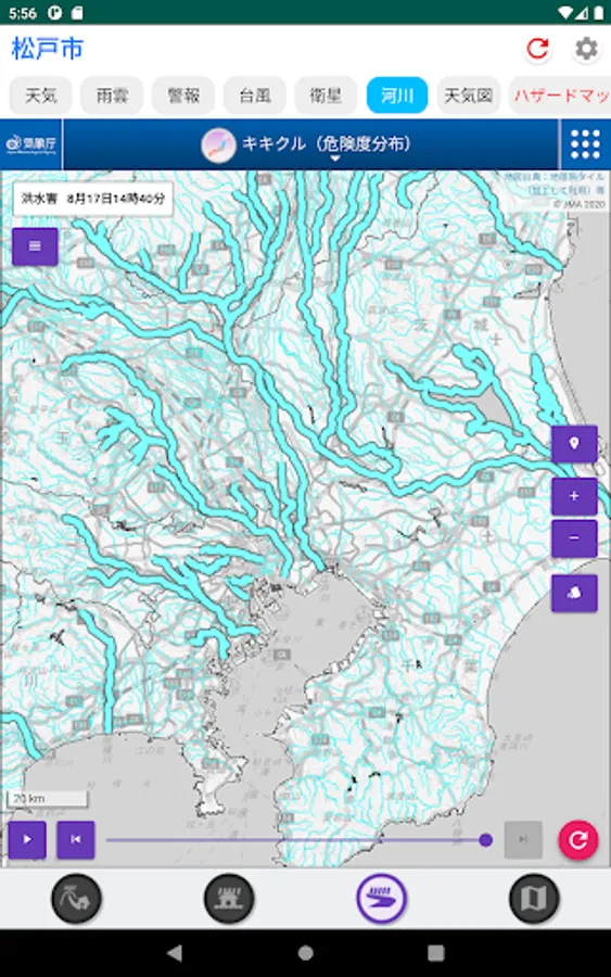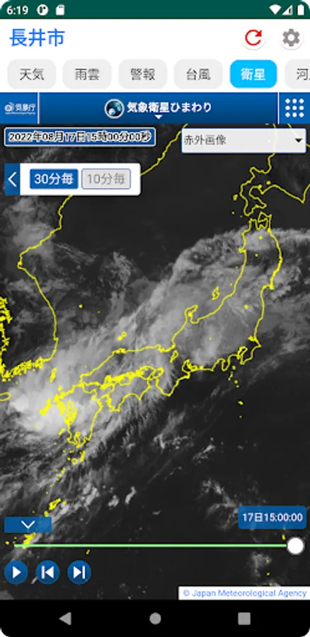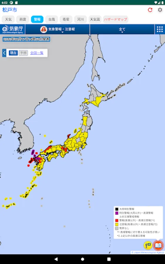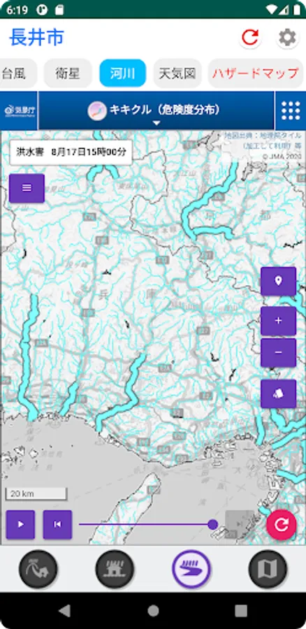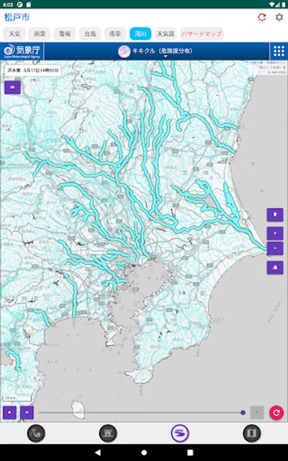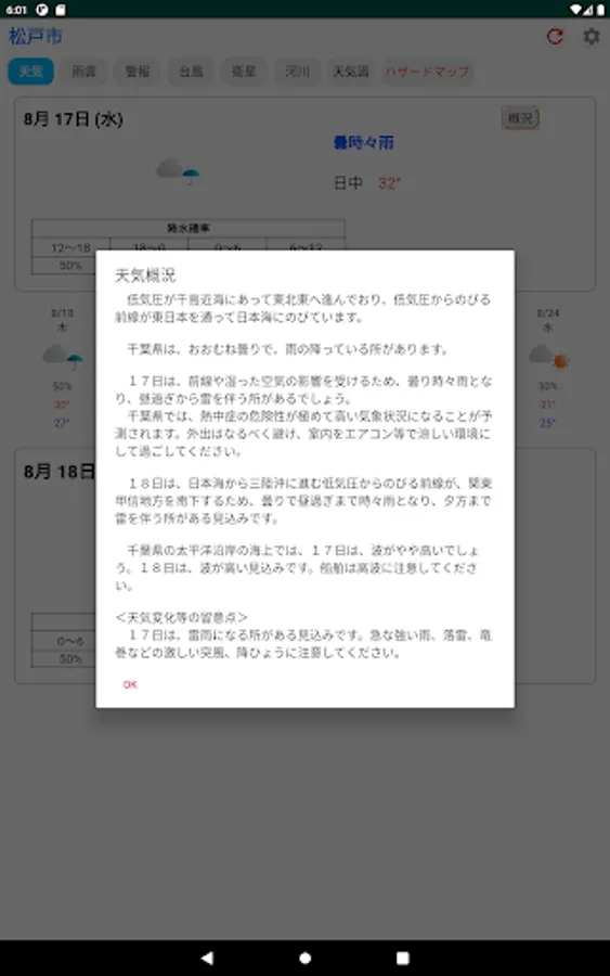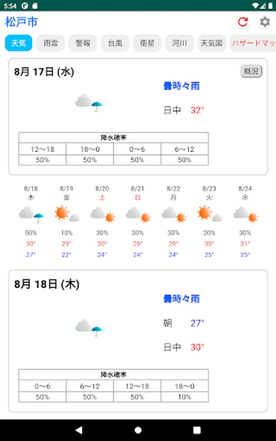 The weather forecast data of the Japan Meteorological Agency has been laid out independently. Also, you can switch to rain cloud, warning, typhoon, and river information by tapping any of the buttons at the top of the screen. Ads are shown, but as little as possible.