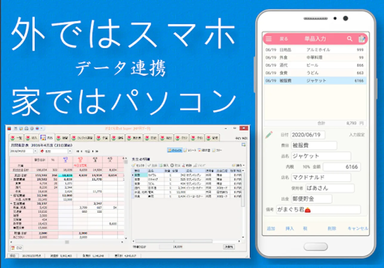 PC版がまぐち君とのデータ連携が可能です。外出先はスマホ版で入力し、帰宅後はPC版で入力すれば入力がスムーズです。