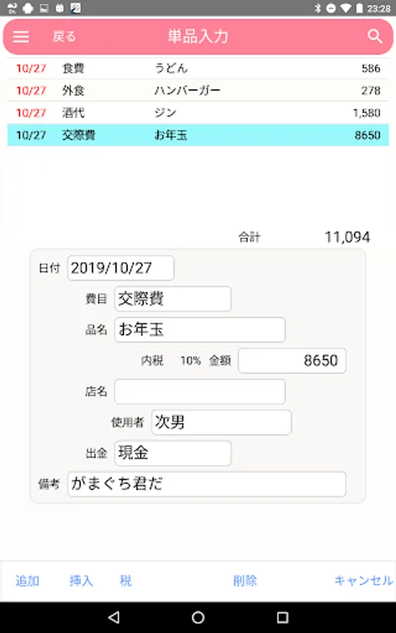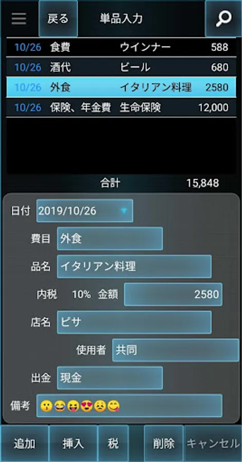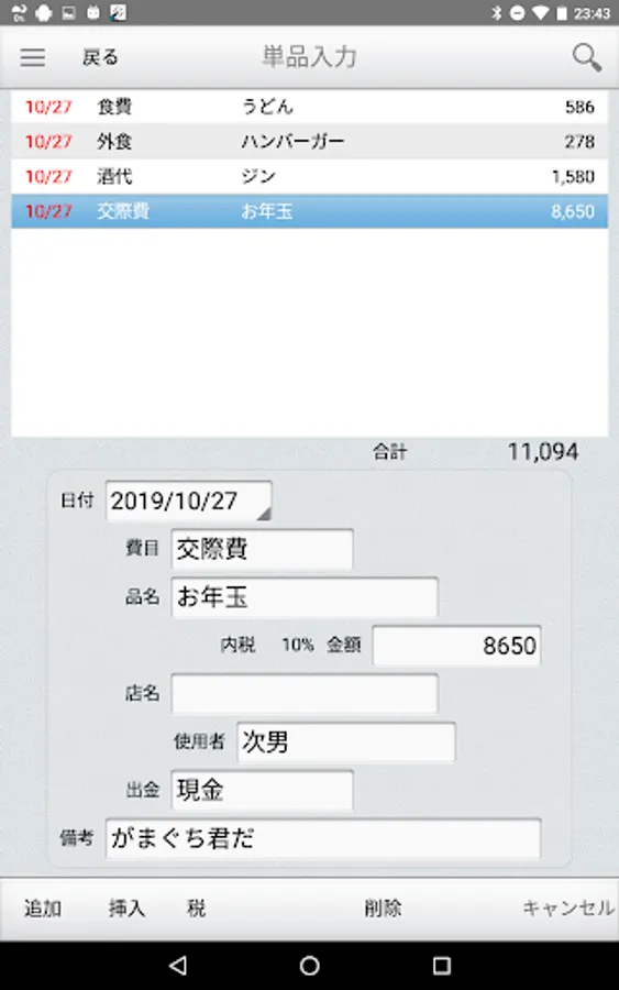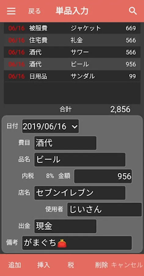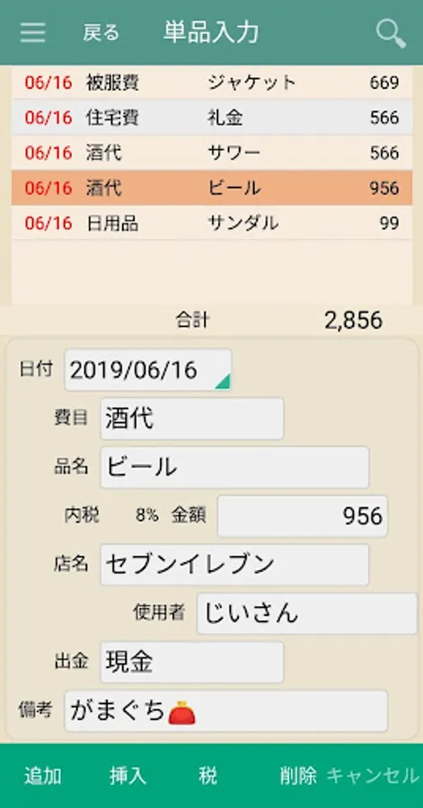 品名、店名、使用者、備考は自由入力でなんでもOK。
