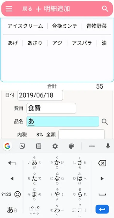 あいまい入力で、費目、品名、店名、使用者の入力候補が自動的に表示されますので、入力は最小限で済みます。