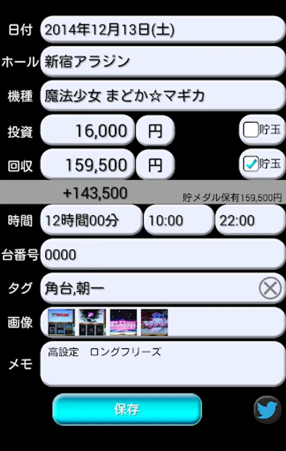 - ホールのクセや回転数などをメモ 機種も指定可能