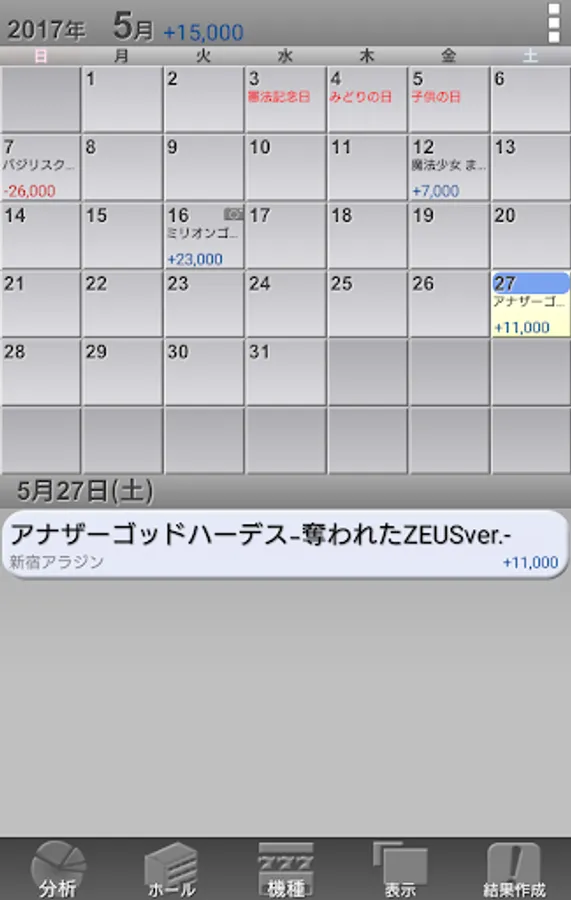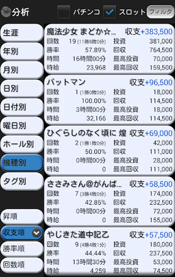 ☆年別、月別、ホールごと、機種ごとなどの勝率、収支結果を一発で表示