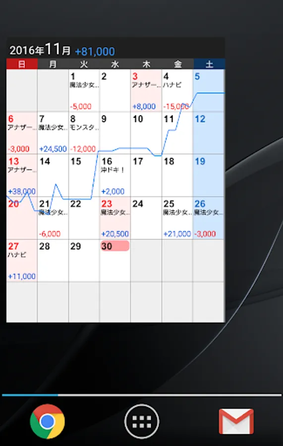☆カレンダーに月の収支結果スランプグラフをオーバーレイ表示