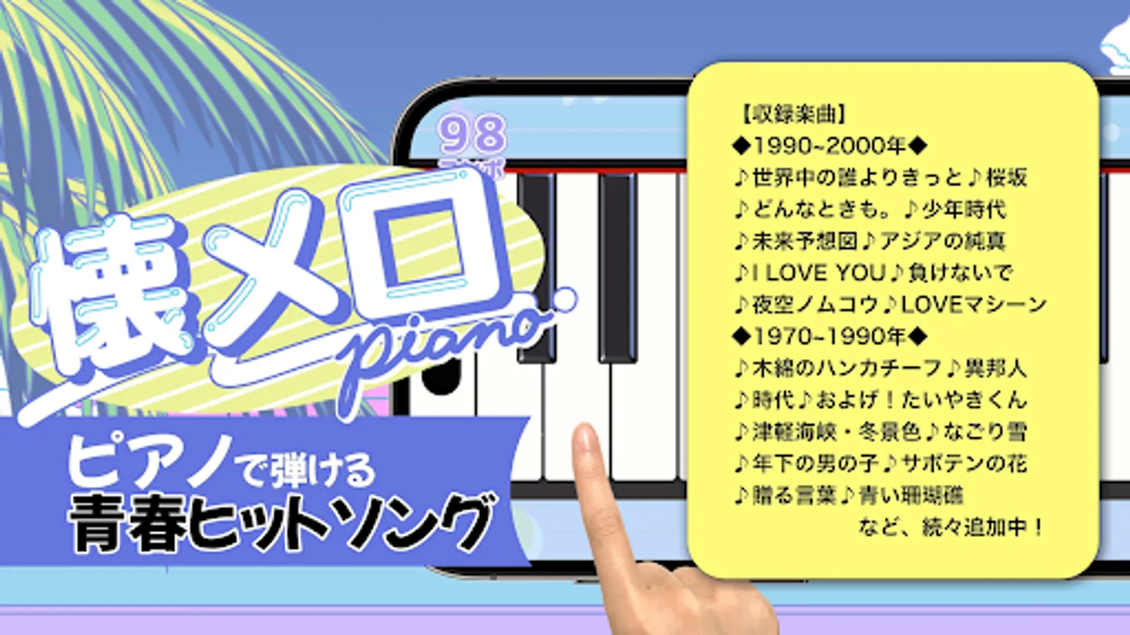 A music game where you can play the piano while enjoying nostalgic songs that everyone knows and popular songs.