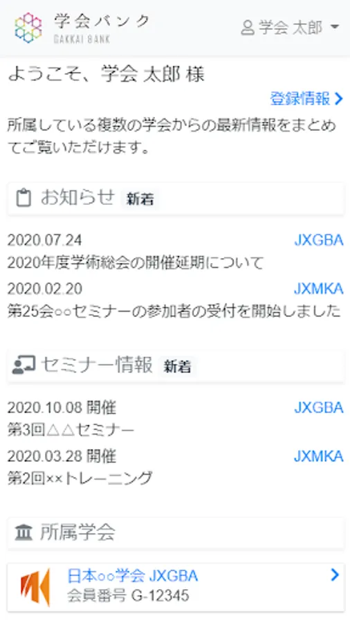 Society Bank is an app for academic members. You can check the latest information from multiple academic societies at once, manage your own personal information, or apply for membership in other academic societies.