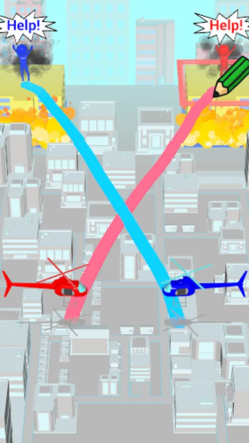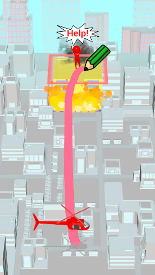 Fire! Draw a line and move the helicopter to help people!