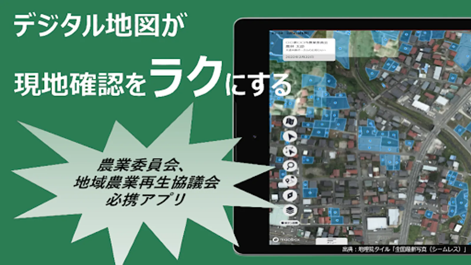 This is an application that supports on-site confirmation by local government officials in the Agricultural Land Act and management income stabilization measures in cooperation with the Ministry of Agriculture, Forestry and Fisheries Geographic Information Common Management System (eMAFF Map).