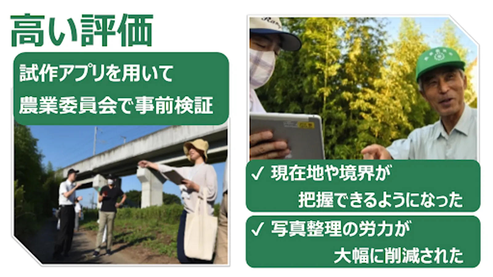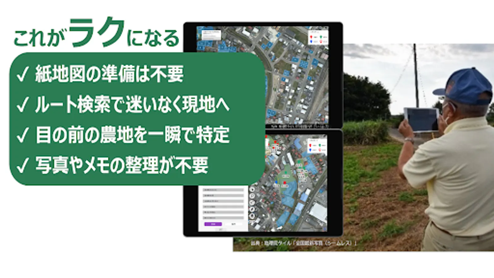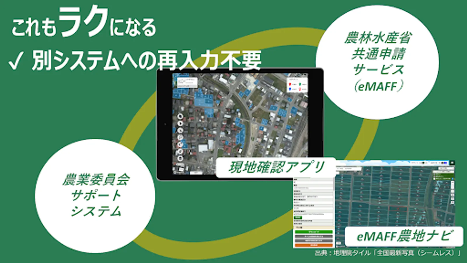 This is an application that supports on-site confirmation by local government officials in the Agricultural Land Act and management income stabilization measures in cooperation with the Ministry of Agriculture, Forestry and Fisheries Geographic Information Common Management System (eMAFF Map).