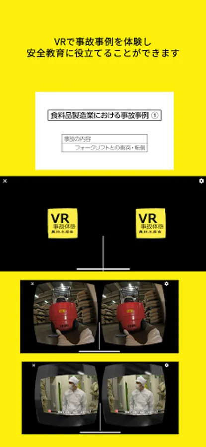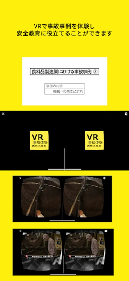 The food manufacturing industry VR work accident experience app is an application for those involved in the food manufacturing industry, where you can experience accidents during work with live-action VR images. For the purpose of raising safety awareness at the site, we also provide information useful for accident prevention.