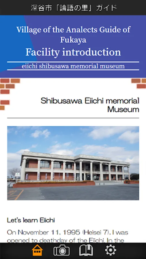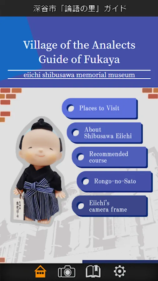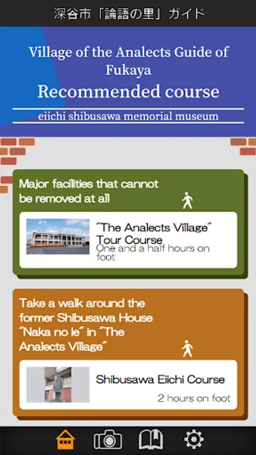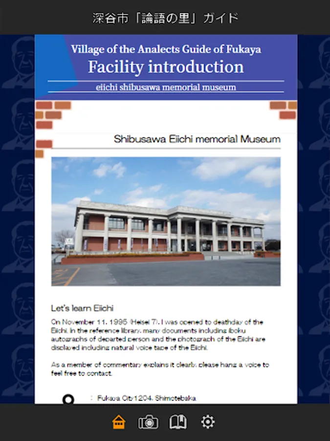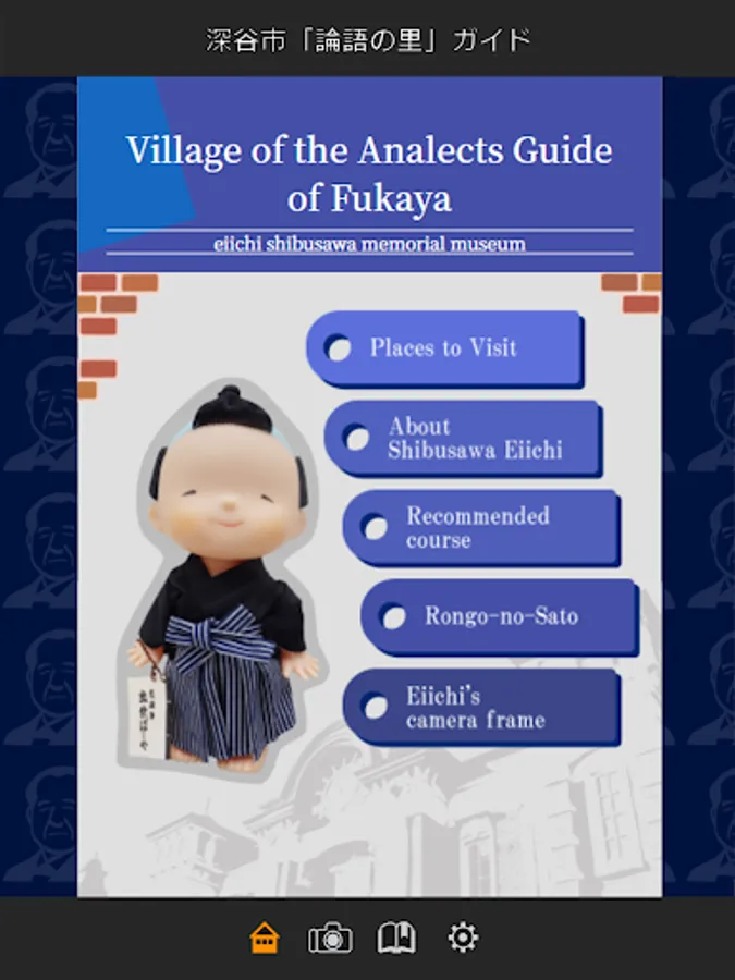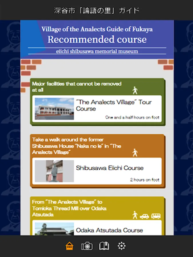 The Official strolling app of Shibusawa Eiichi memorial Museum in Fukaya City, Saitama Prefecture. A detailed navigation service, which also introduces fascinating spots around the city, especially places connected to Shibusawa Eiichi Rongo-no-Sato (Village of the Analects of Confucius), originally from Fukaya City. App has a function that shows recommended routes connected to Shibusawa Eiichi, to navigate the city, and shows recommended routes on a map. Another function worthy of note is the ability to search for desired spots.