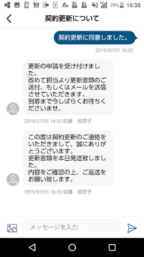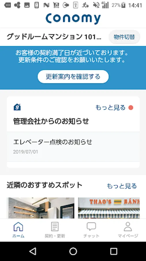 更新時期が近づくと、管理会社様よりアプリ内のメッセージにて通知が届きます。