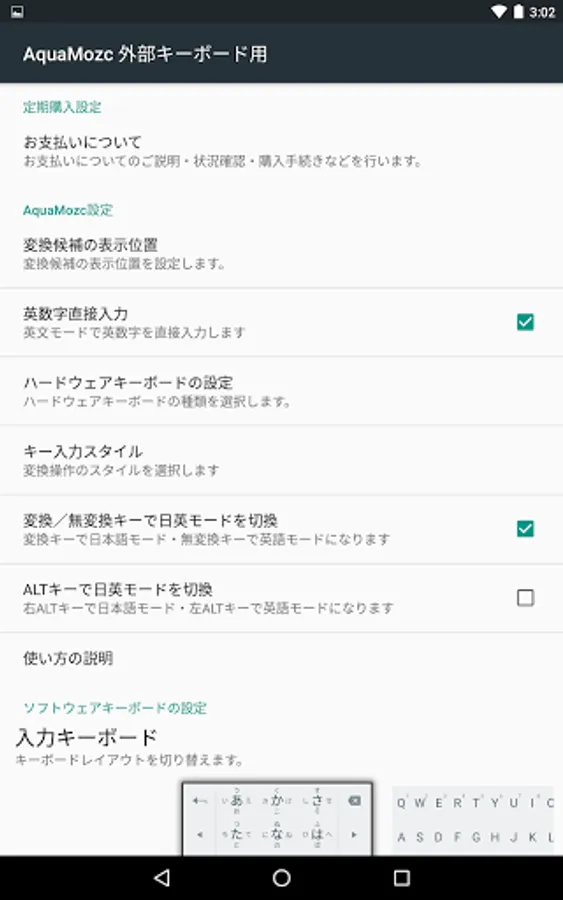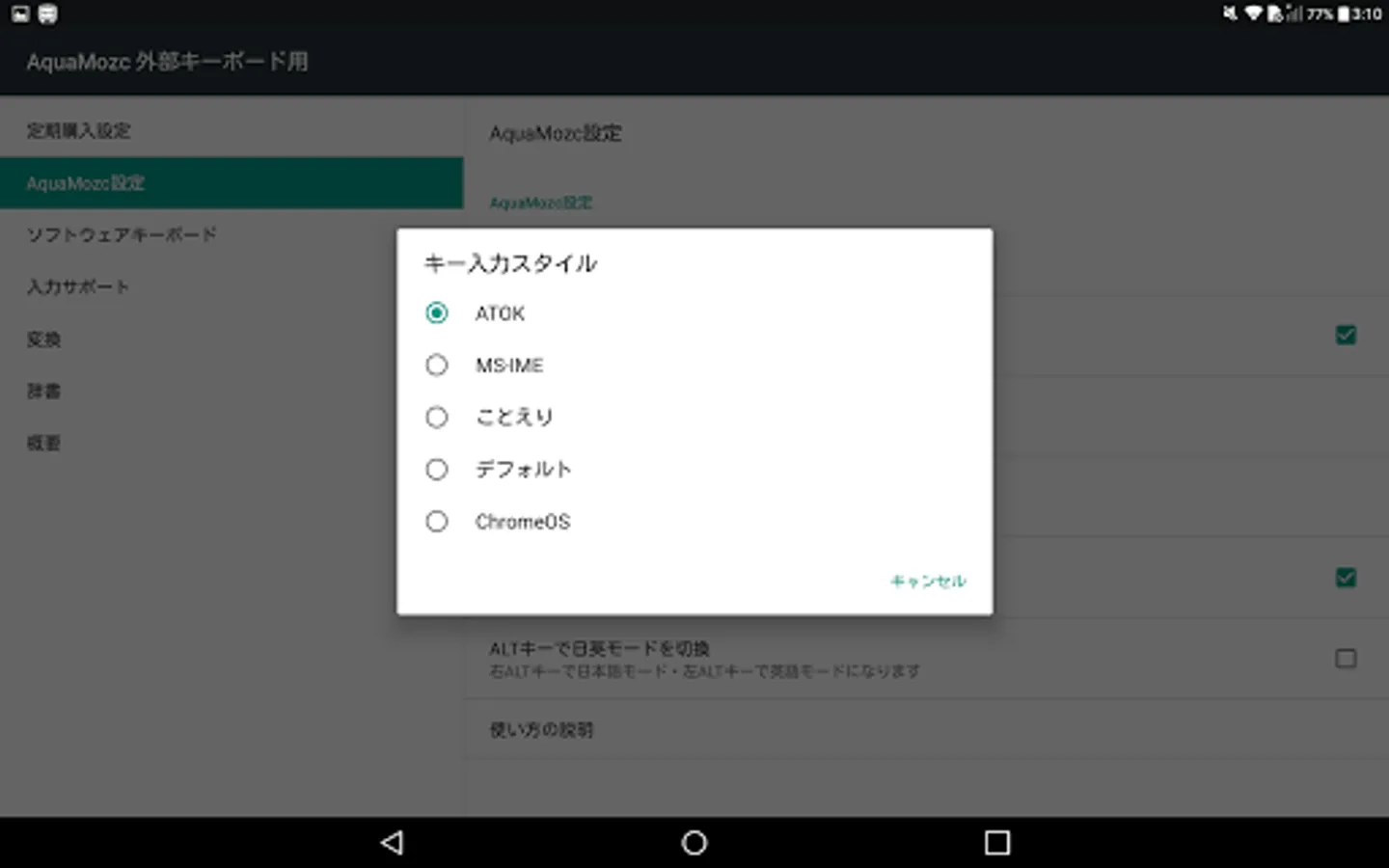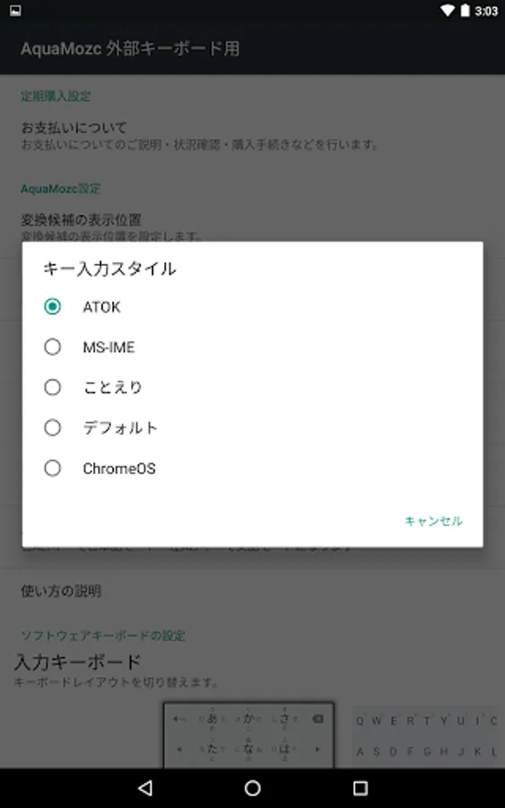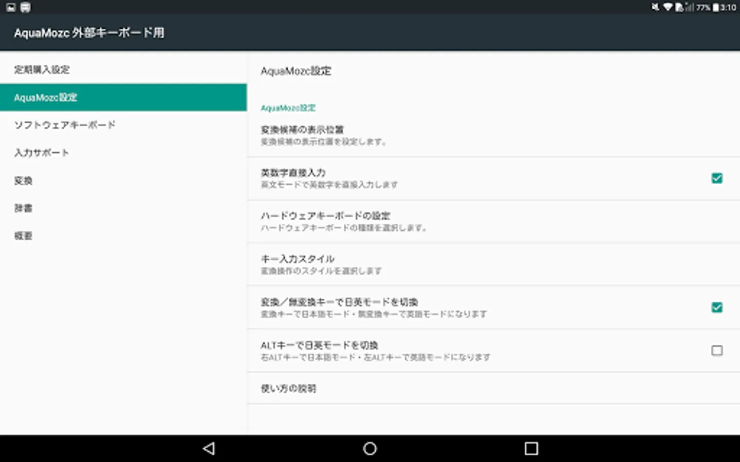 AquaMozc (this app) is based on the IME app called Mozc (https://github.com/google/mozc) released as an open source version, and is optimized for the external keyboard of Android devices. It will be an IME app.