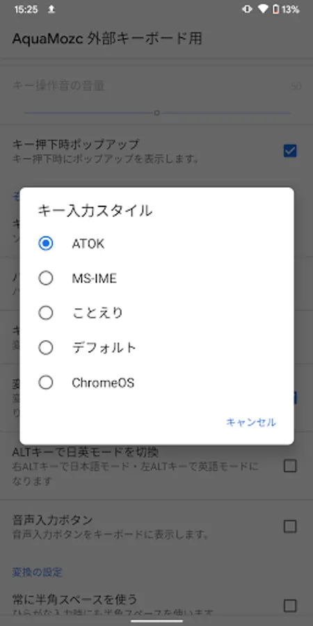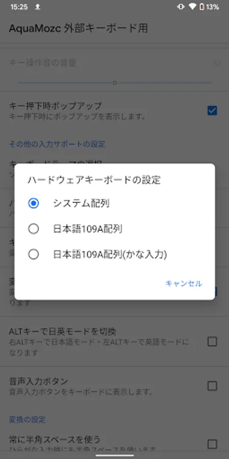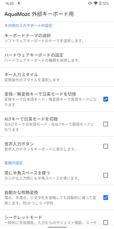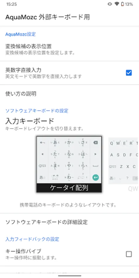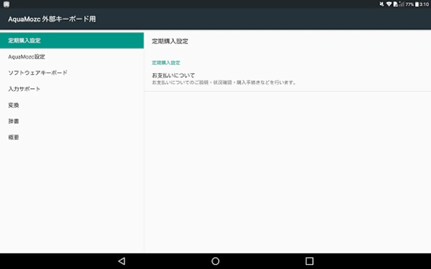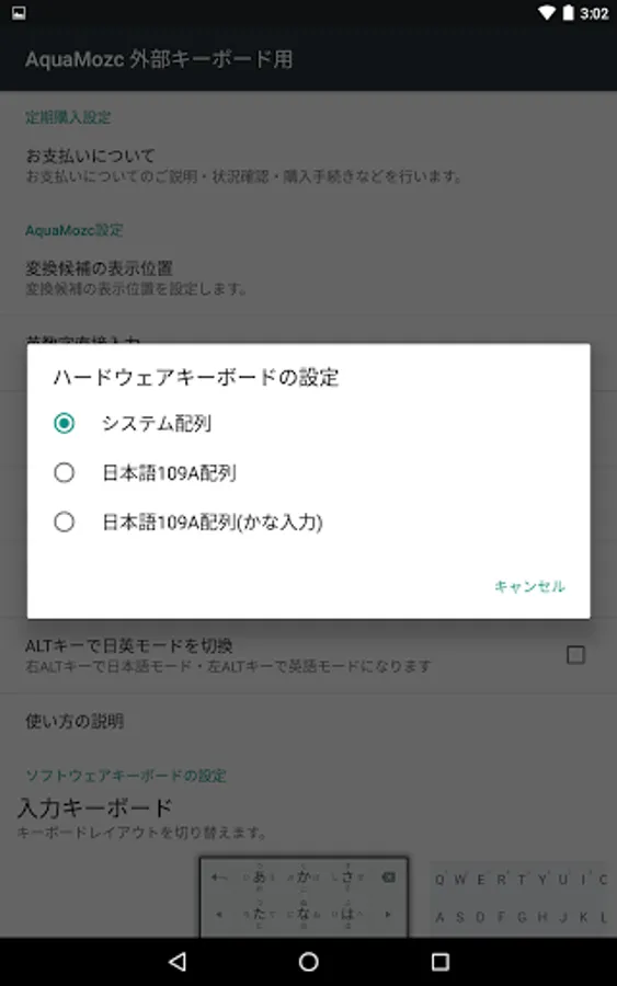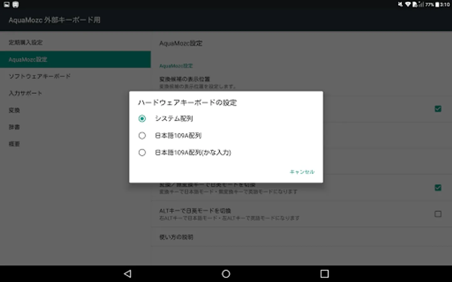 AquaMozc (this app) is based on the IME app called Mozc (https://github.com/google/mozc) released as an open source version, and is optimized for the external keyboard of Android devices. It will be an IME app.