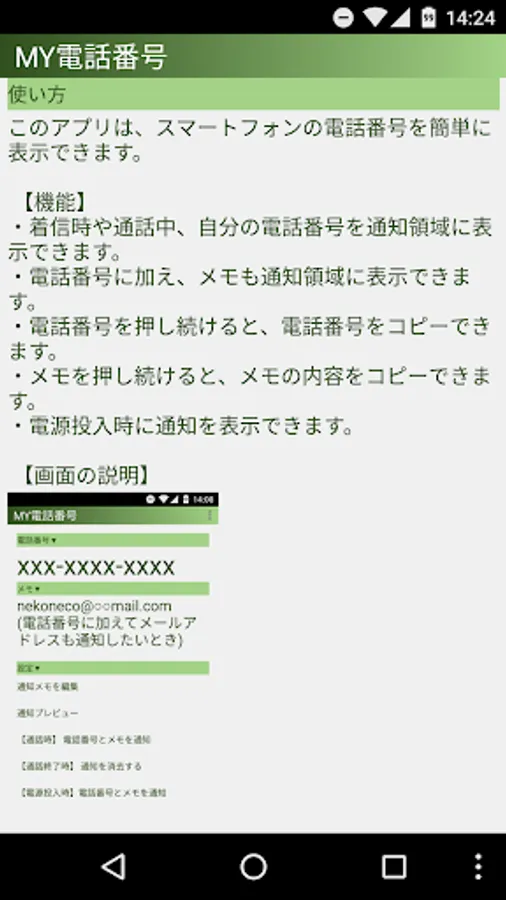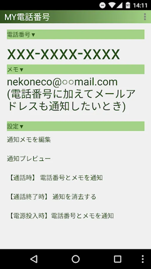 このアプリでは、自分の電話番号を簡単に表示することができます。
