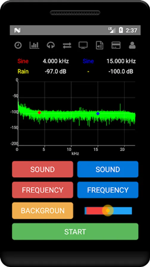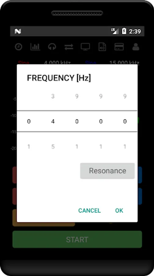> Sine wave, the frequency is variable from 0 to 22 kHz, with resonance effect.