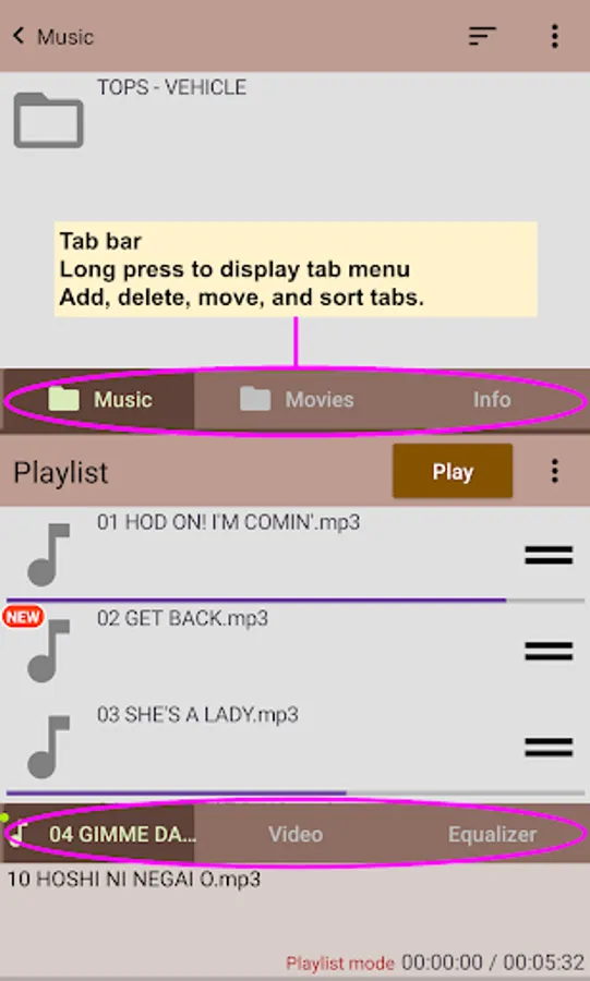 Two split-screen tabbed displays allow selection of functions. Multiple folders and playlists can be arranged.