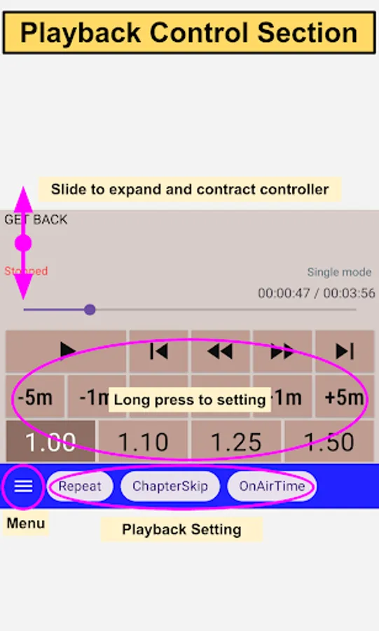 Time-stretching function to change the playback speed without changing the pitch, settable from 0.25x to 4x.