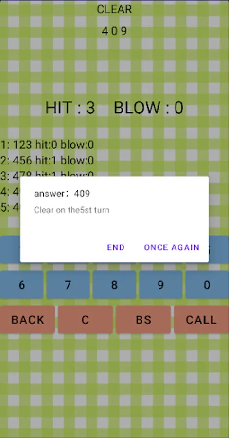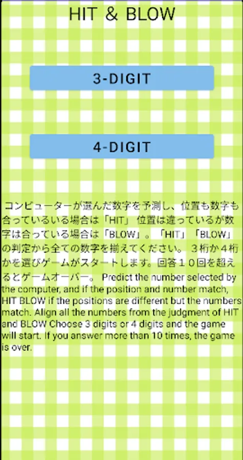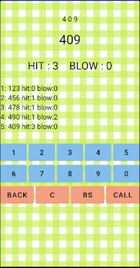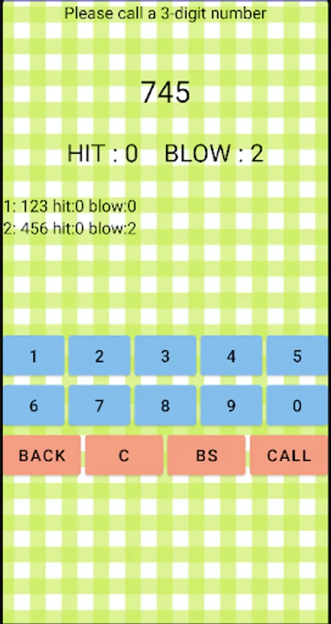The game starts by choosing 3 digits and 4 digits. Enter with the number buttons and judge with CALL. "HIT" if the number and location match. "BLOW" when the number is correct but the location is wrong. 10 CALLs will result in game over.