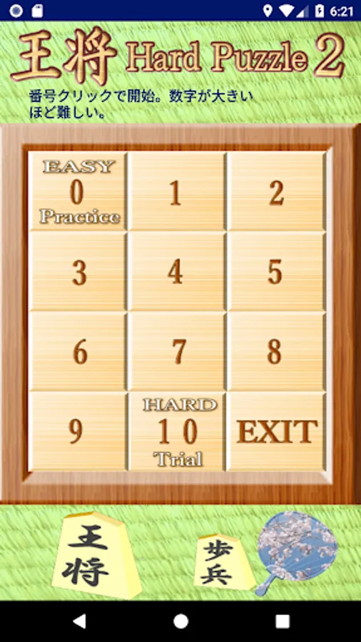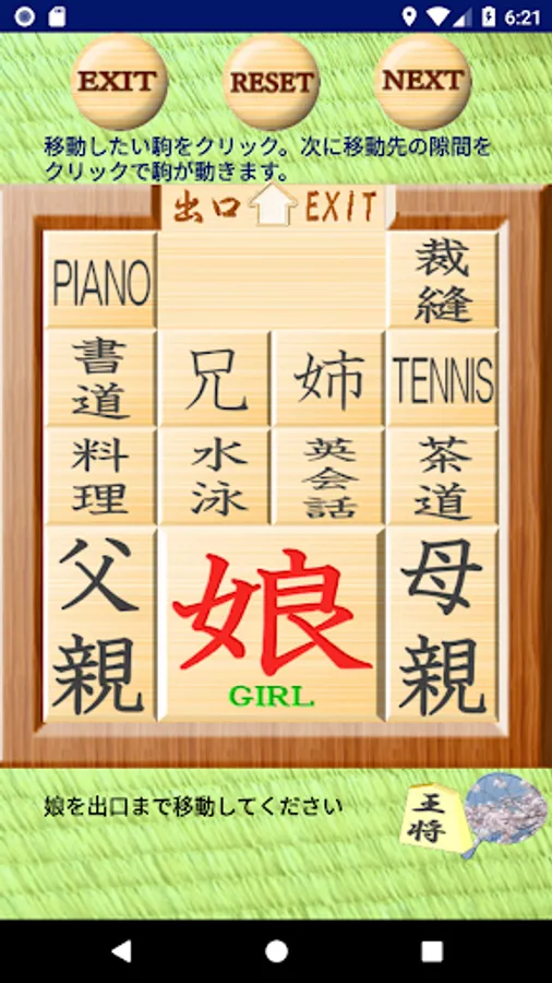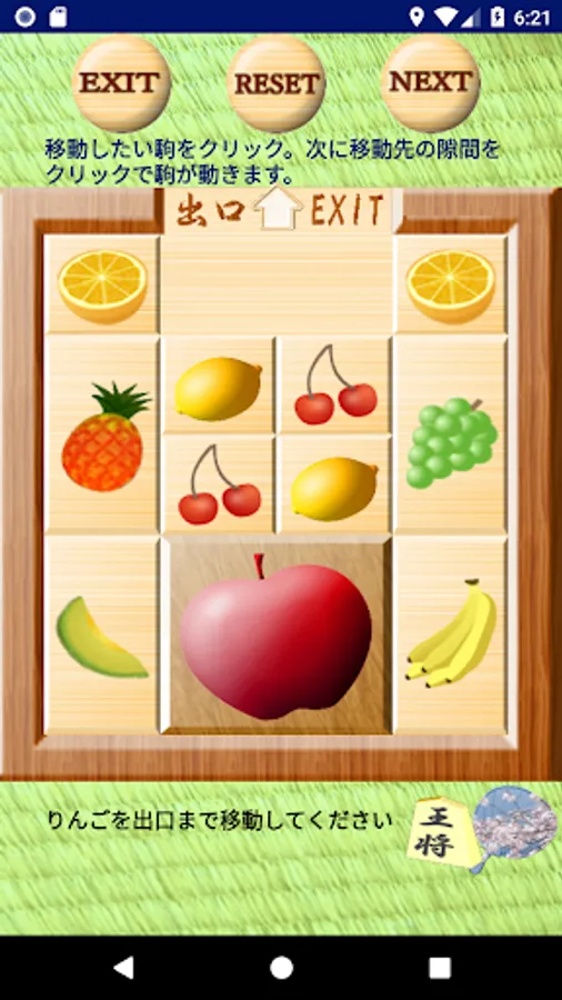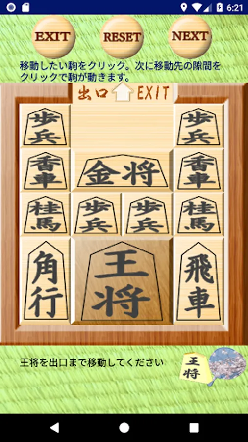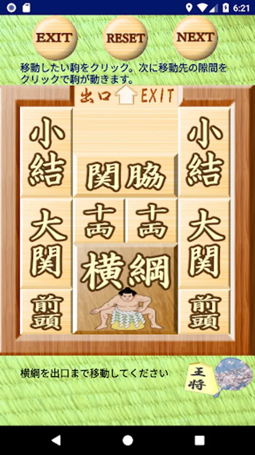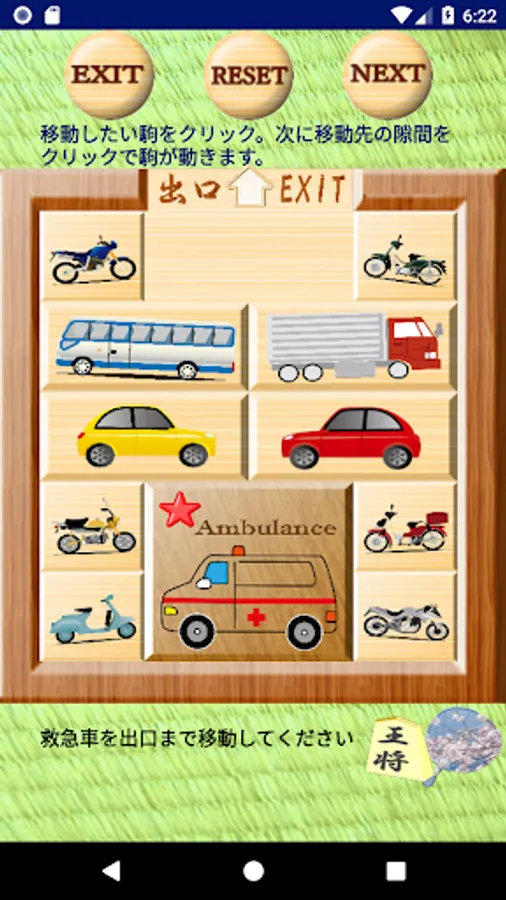 木枠に並べられた駒を移動させて、大きな駒(王将、娘、救急車、横綱)を出口から運び出すスライディングブロックパズルです。