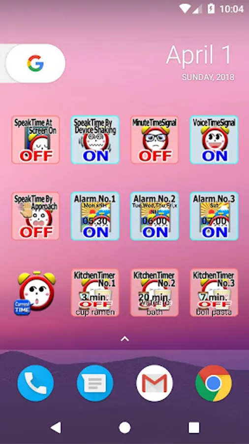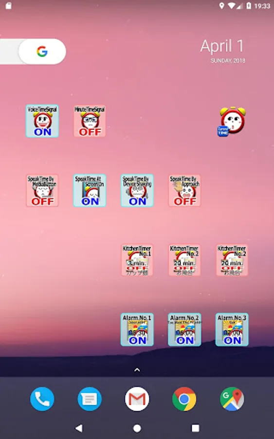 11. AppWidgets support for 'Voice time signal', 'Speak time at screen on', 'Speak time by media button', 'Speak time by device shaking', 'Alarm' No.1 - No.3, 'Kitchen timer' No1. - No.3.