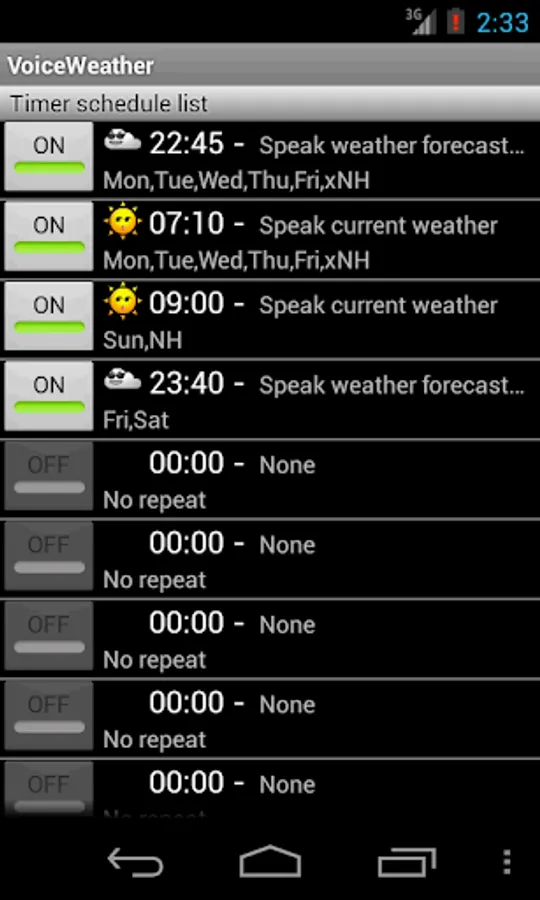 In addition, 'current weather' or 'a weather forecast' will be spoken on the scheduled time by timer schedule feature.