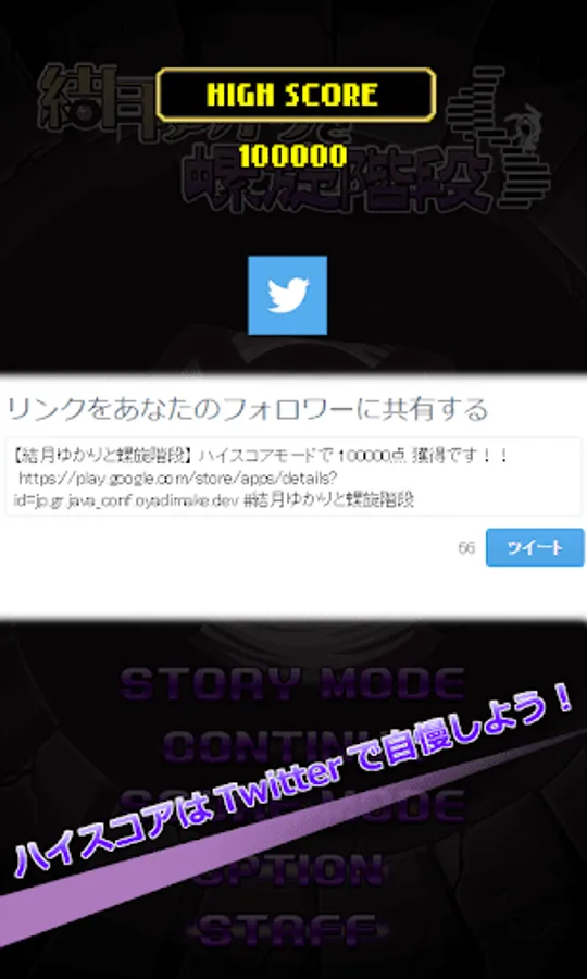 ハイスコアモードでは制限時間内にハイスコアを狙い、Twitterへ投稿して自慢しよう!