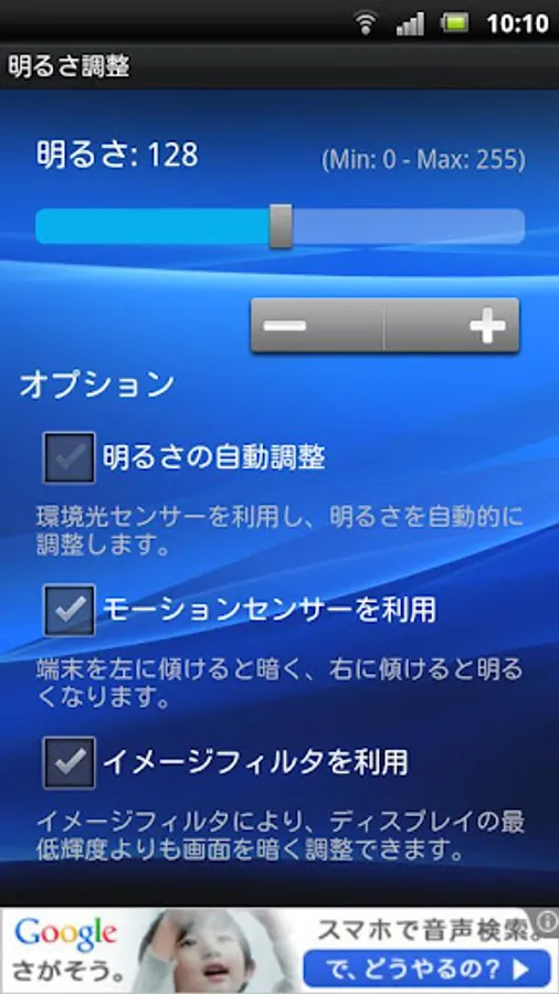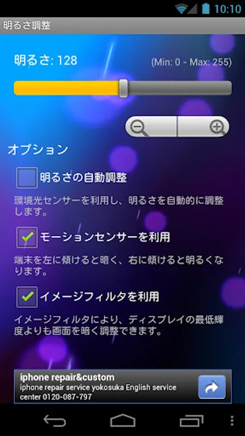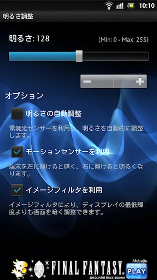 The effect of filter software, you can dim the screen beyond the minimum luminance of the display. Please use it if you feel bright and a display by the scene, for example, if you want to prevent prying eyes from the surroundings. With just a touch of a seek bar, which is also features that you can adjust the intensity of image effects filters and seamlessly adjust the brightness of the standard.