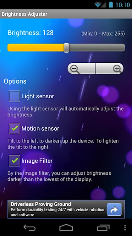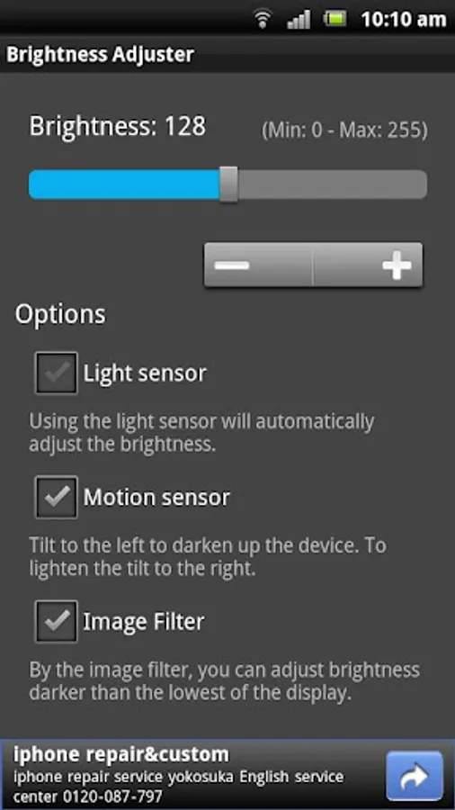 A device that supports a standard "switch enable/disable" In automatic adjustment brightness of illumination sensor, can be performed on this application to check the brightness after the change and setting on/off of automatic adjustment.