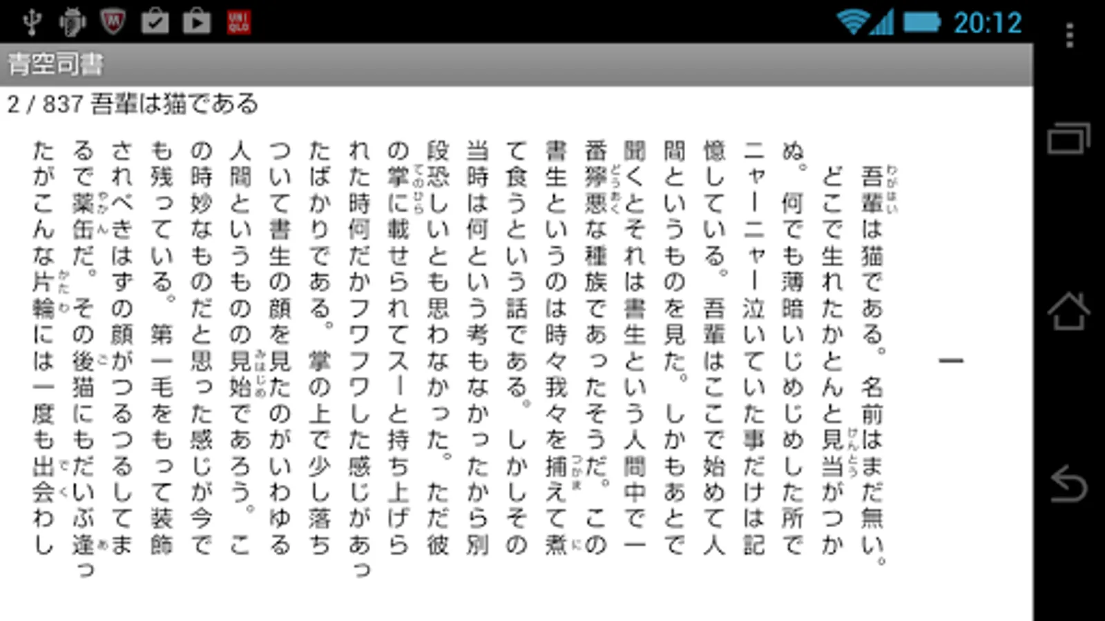 青空司書は、青空文庫リーダー/ダウンローダーです。青空文庫の作品をダウンロードし、縦書き表示で読むことができます。青空文庫以外のテキストファイルを読み込み、テキストリーダーとしても使用できます。音声読み上げ(TTS)にも対応しています。音声認識にも対応しています。広告は非表示にできます。
