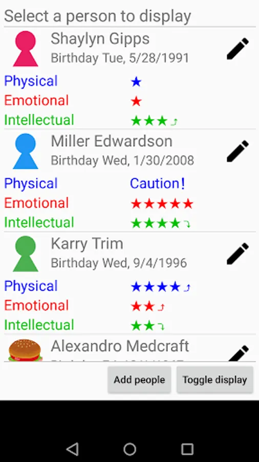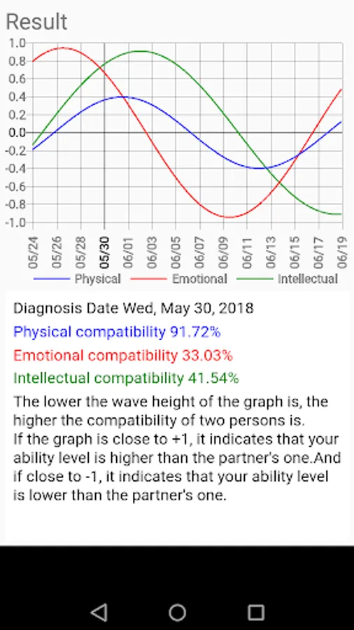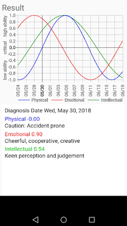 Calculate the biorhythm and display the state of the physical, emotional and intellectual aspects.