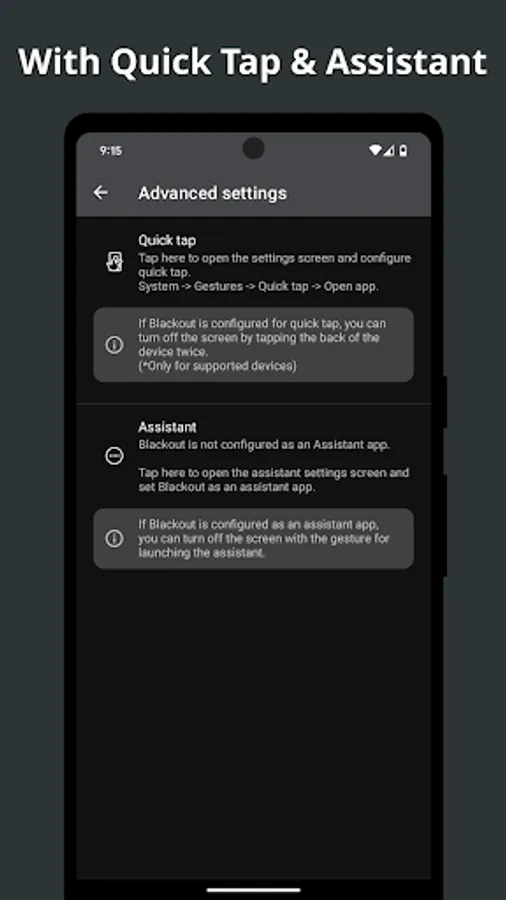 ✓ Work with double-tap on the back (quick-tap) or gesture of the assistant (*only on supported devices)