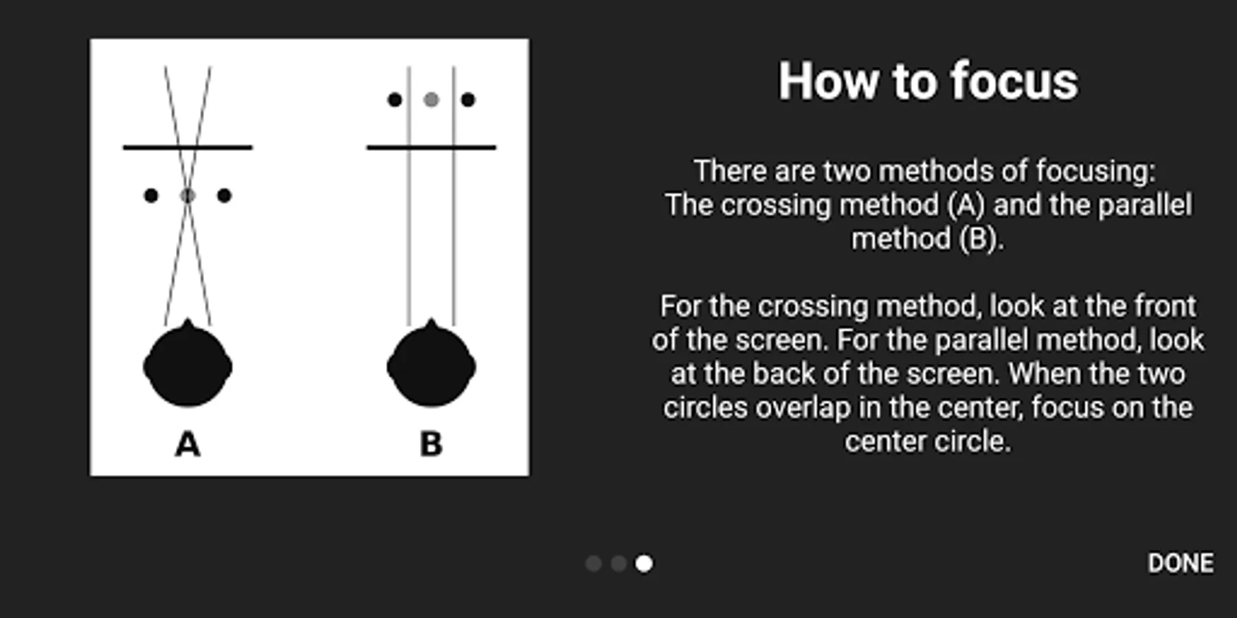 A. Crossing method - focus on the front of the screen. (Crossed eyes)