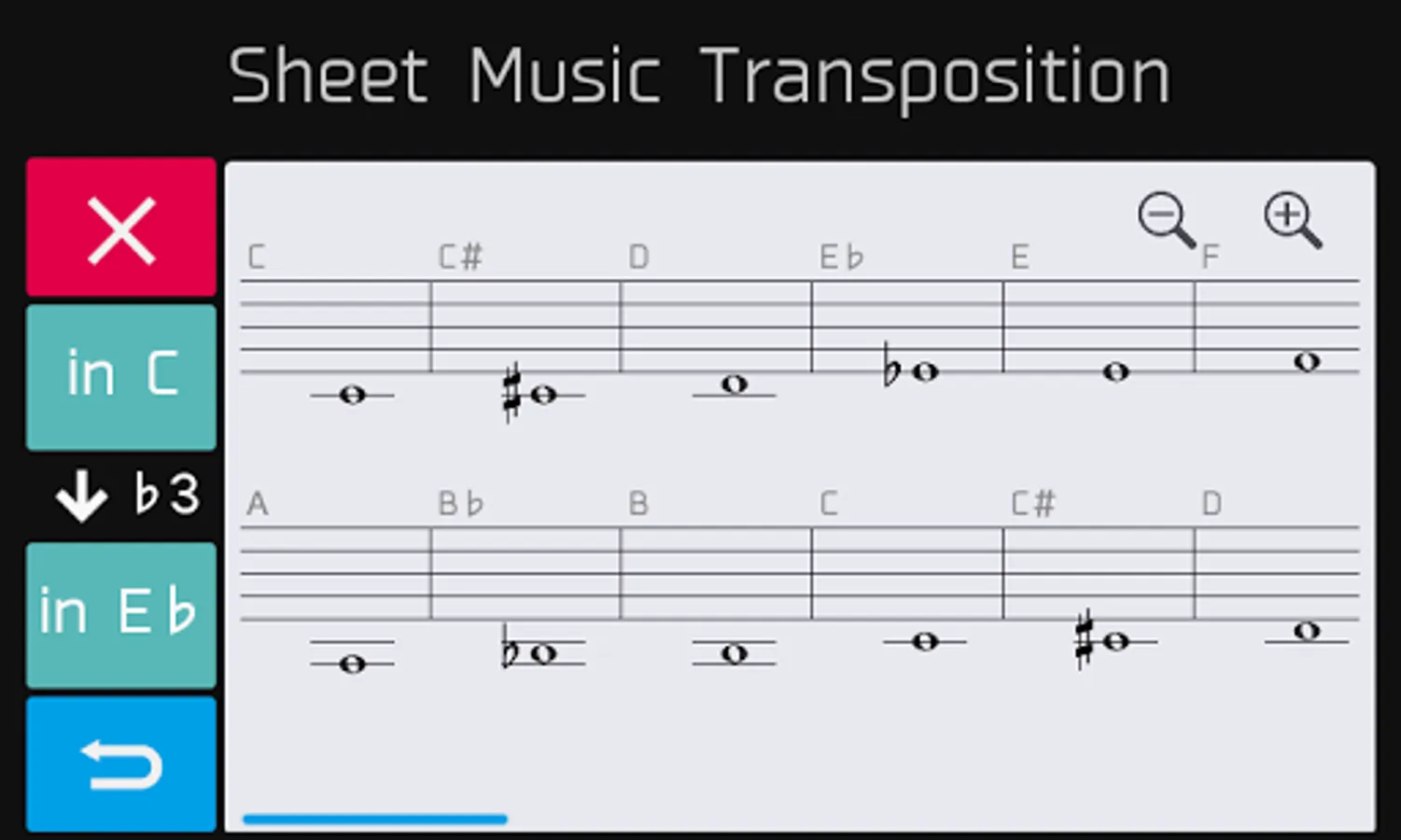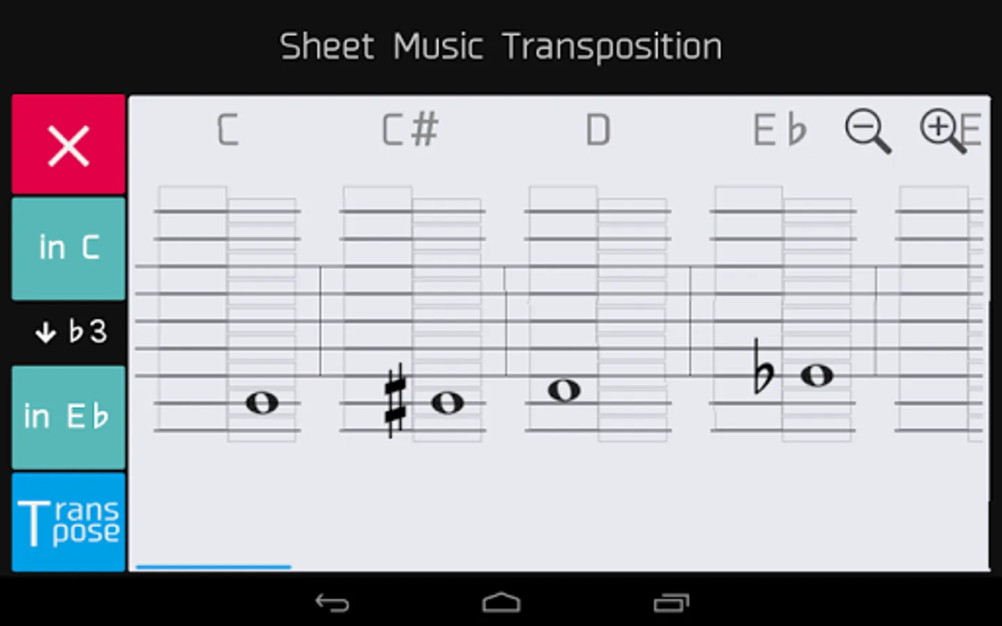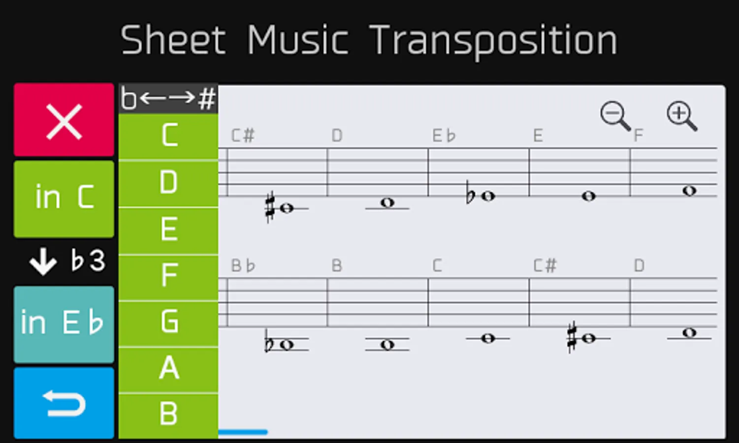 For example, if you want to transpose from piano to alto sax, the input key "C", the output key, set the "Eb".