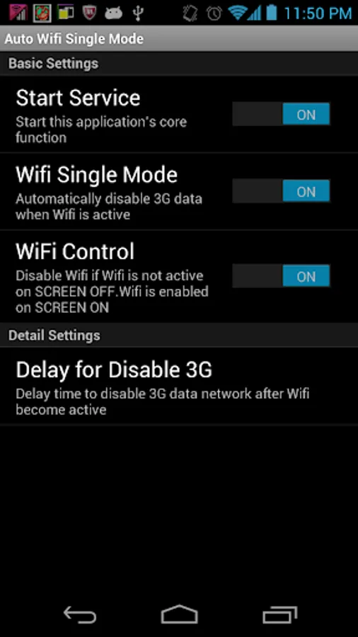 This application also has optional function which disable Wifi when Wifi is disconnected with screen off condition. In case of screen on, Wifi is always enabled.