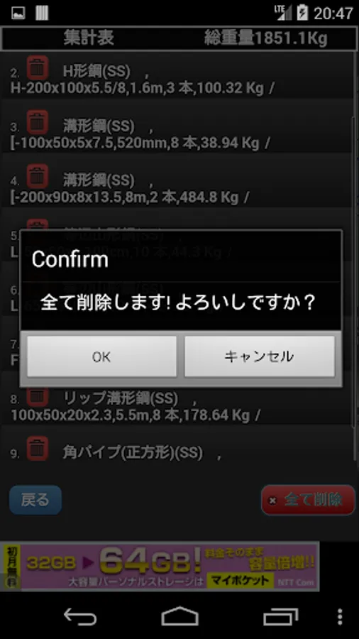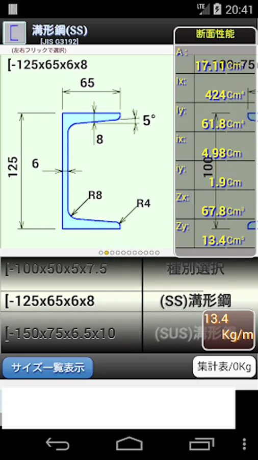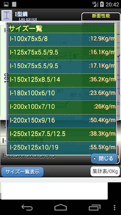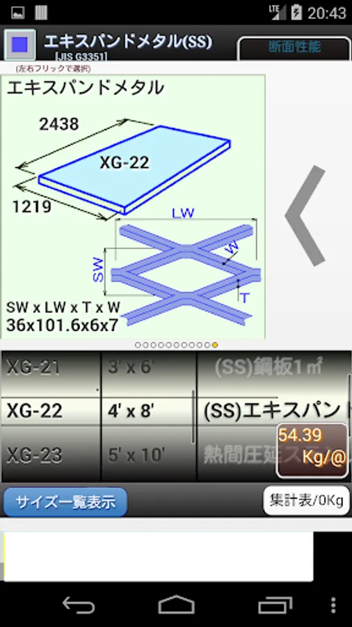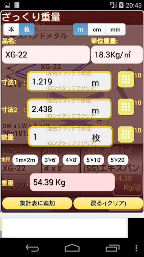 Go to the weight calculation screen by tapping the part that displays the unit weight, and automatically calculate the total weight by entering the quantity and size. I also can also create a spreadsheet.