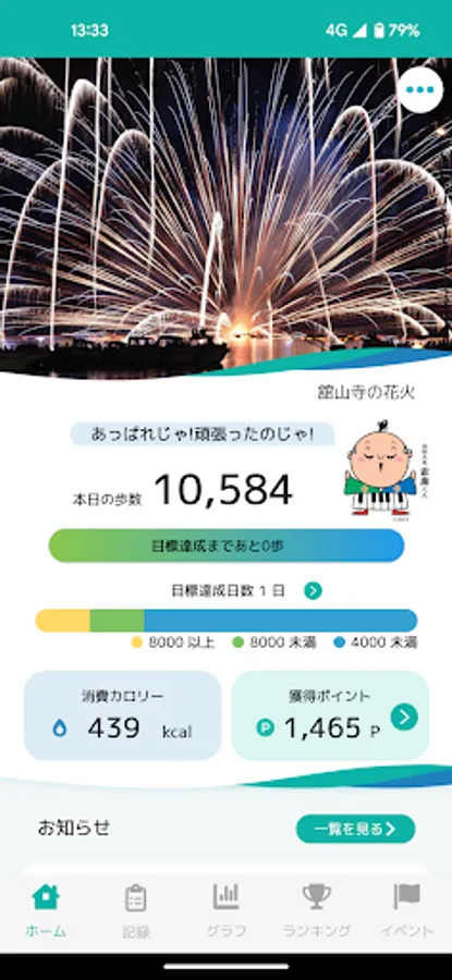 Hamamatsu City's mascot character Hamamatsu Fuku Mayor "Seise Daimyo Ieyasu-kun" will support you according to the progress of your steps.