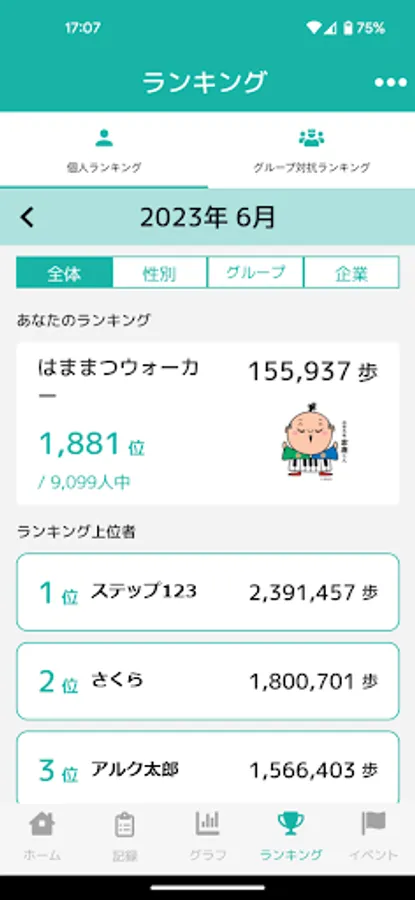 Step count display/target step count achievement rate and number of days achieved/calorie consumption display/weight/blood pressure/medical examination record/BMI display/monthly step count/distance/calorie consumption/weight/blood pressure graph display / Personal ranking (overall, gender, group, company) / Various health event participation confirmation (QR) / Real walking / Column distribution / Challenge / Notification distribution from Hamamatsu City / Questionnaire distribution / Handover function / Inquiry