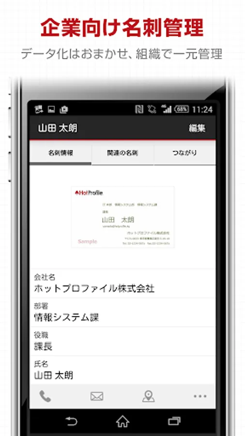 "Hot Profile" organically connects business processes divided in the three areas of business card management, marketing measures, and sales force automation (SFA), and realizes sales and marketing automation. This app allows sales staff to check frequently used business cards on the go, reporting operations, and checking the latest integrated customer information.