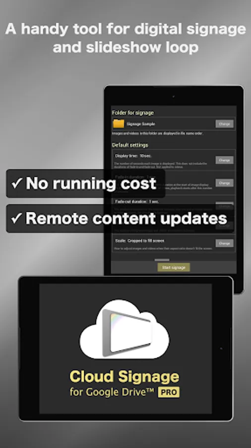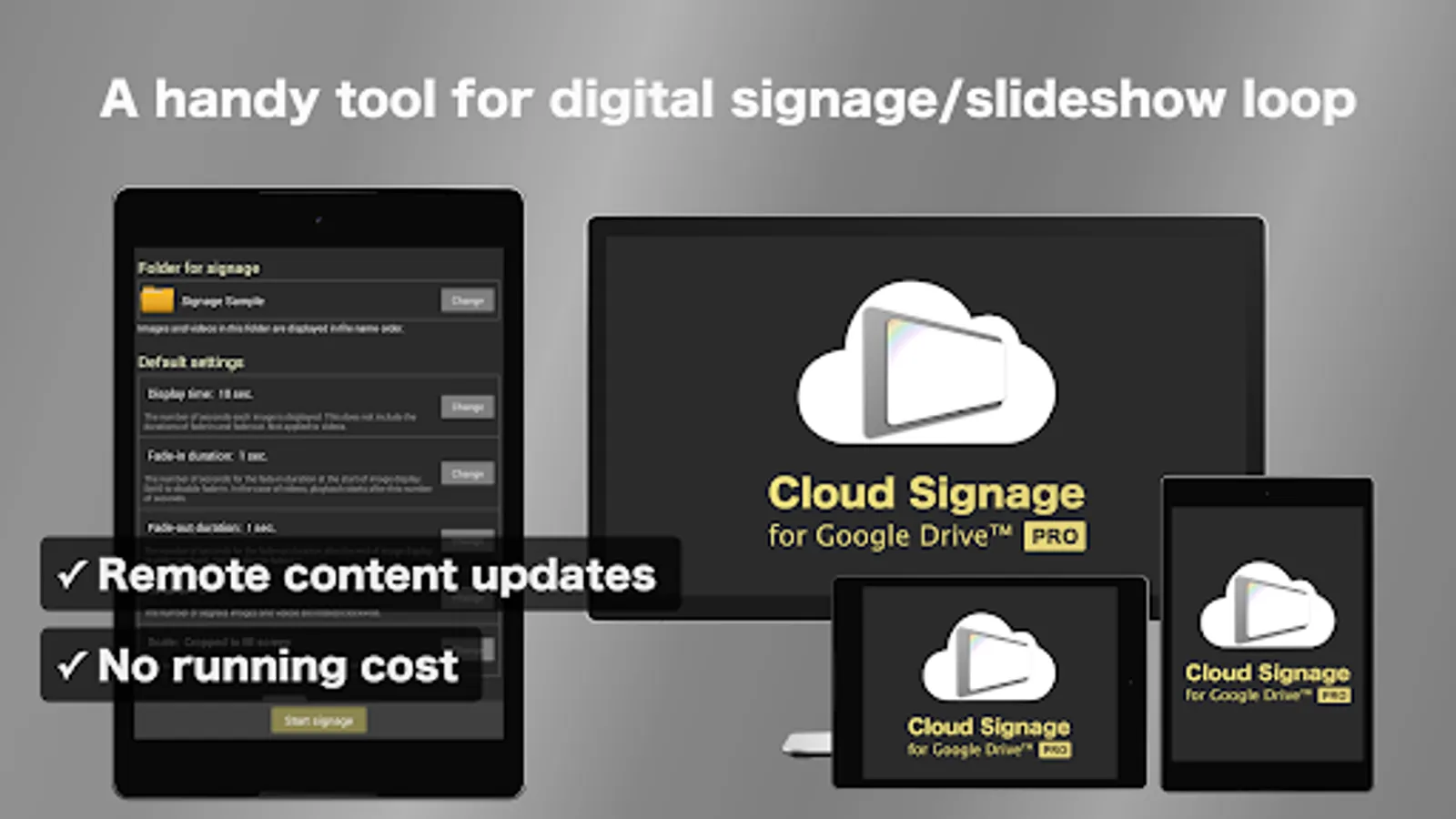 Cloud Signage for Google Drive™ PRO is an easy-to-use digital signage app that can update content remotely but does not require paid subscription, integrated with Google Drive.