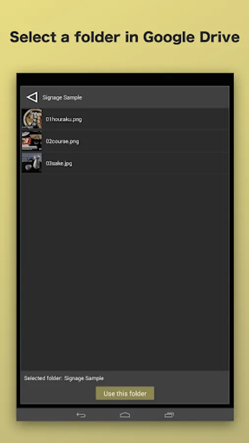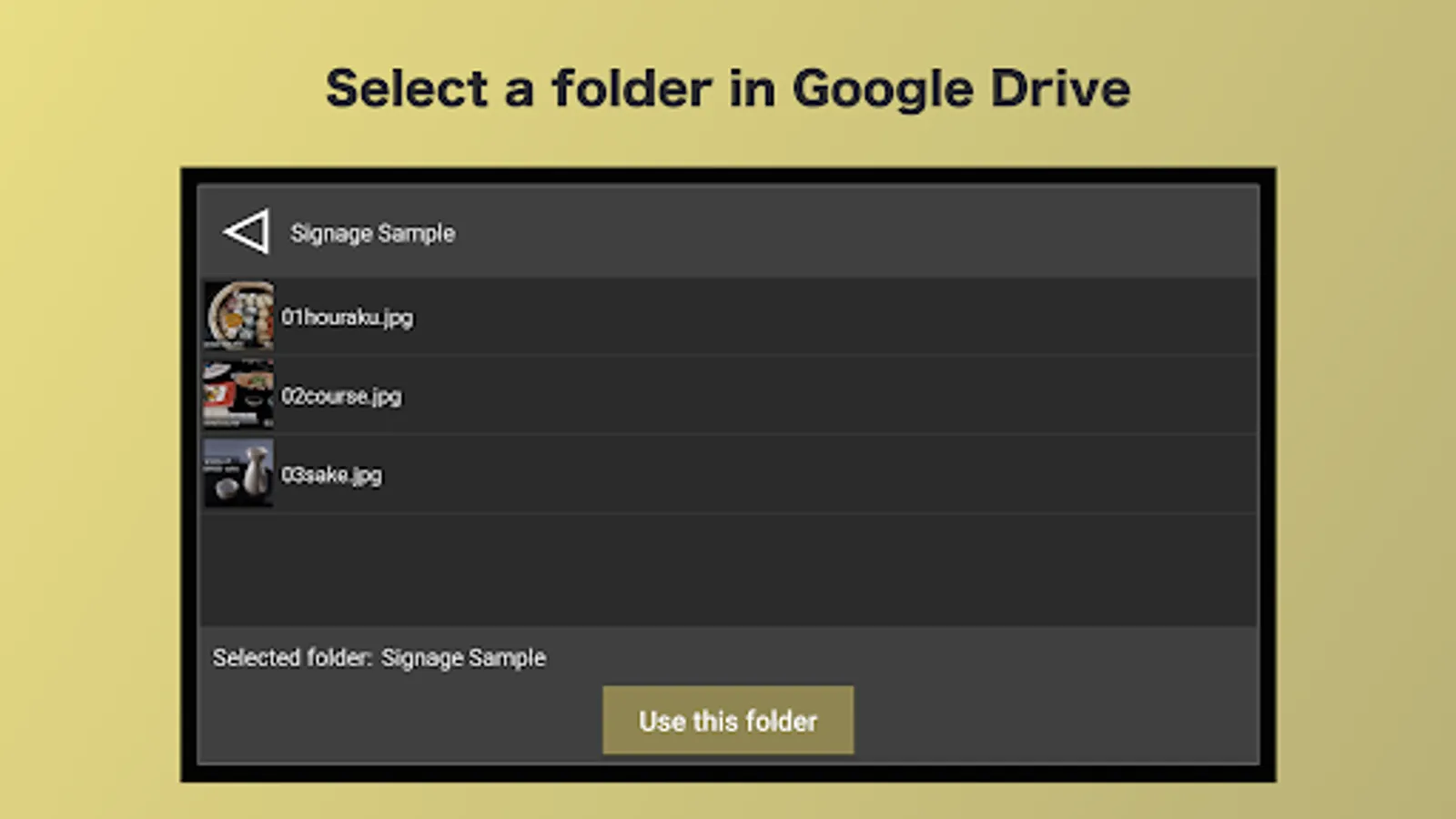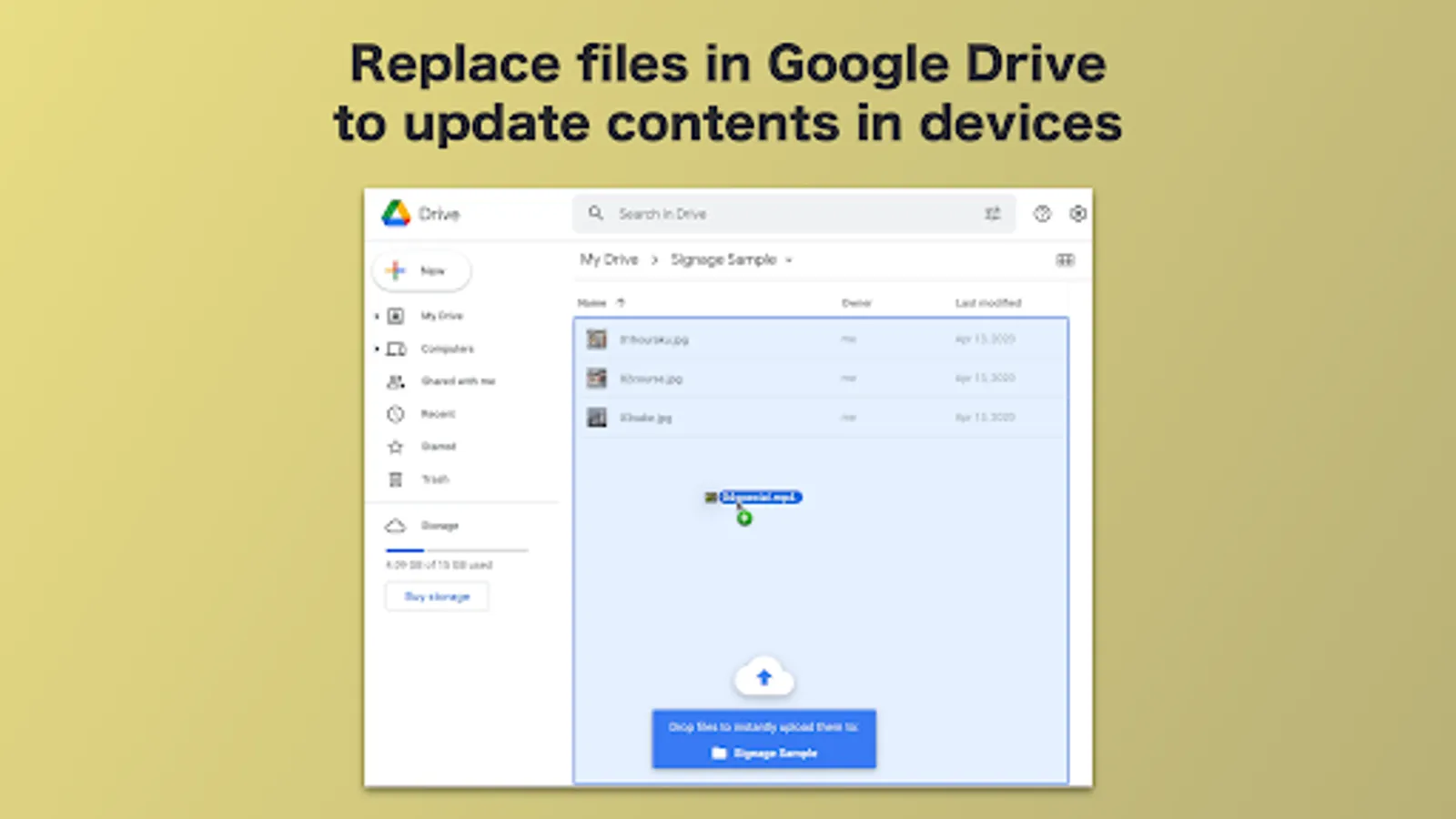 Digital signage content can be automatically updated by just placing images and videos in a designated folder in the Google Drive.