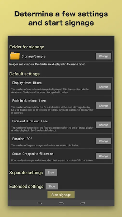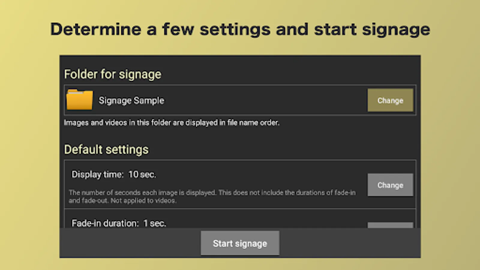Just a handful of settings to start your image/video slideshow loop. Of course, there are more advanced settings.