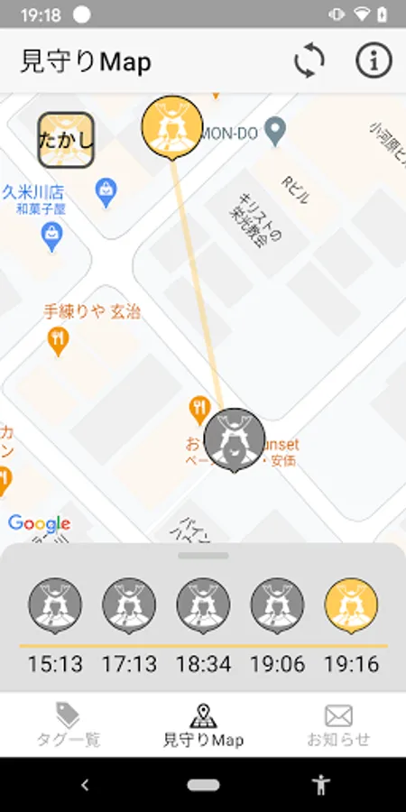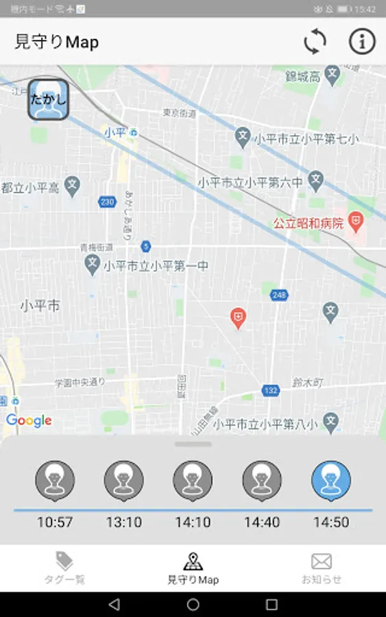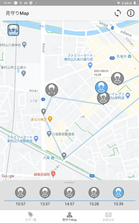 When a tag (device to be watched) registered in this application is detected by a communication base station installed in Niihama city or a smartphone running this application, its location information is displayed on the map. * Tags used in this app (devices to be watched over) will be provided when you apply for the service.