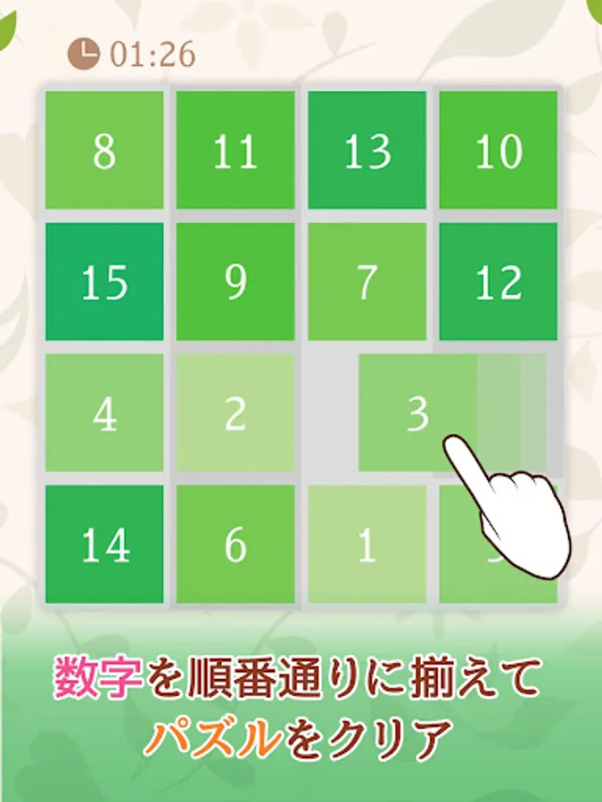 数字やイラストを正しい順番に並び替えるシンプルなパズルです。