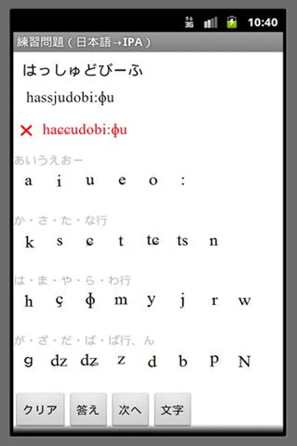 With the button "answer", notation by the IPA and the correct "○ / ×" is displayed.