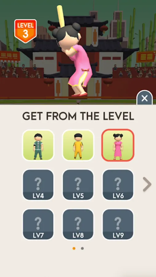 Every time you’re upgraded to a new level, 1 new Skin will be unlocked. Feel free to choose your favorite Kung fu character to enter the stadium.