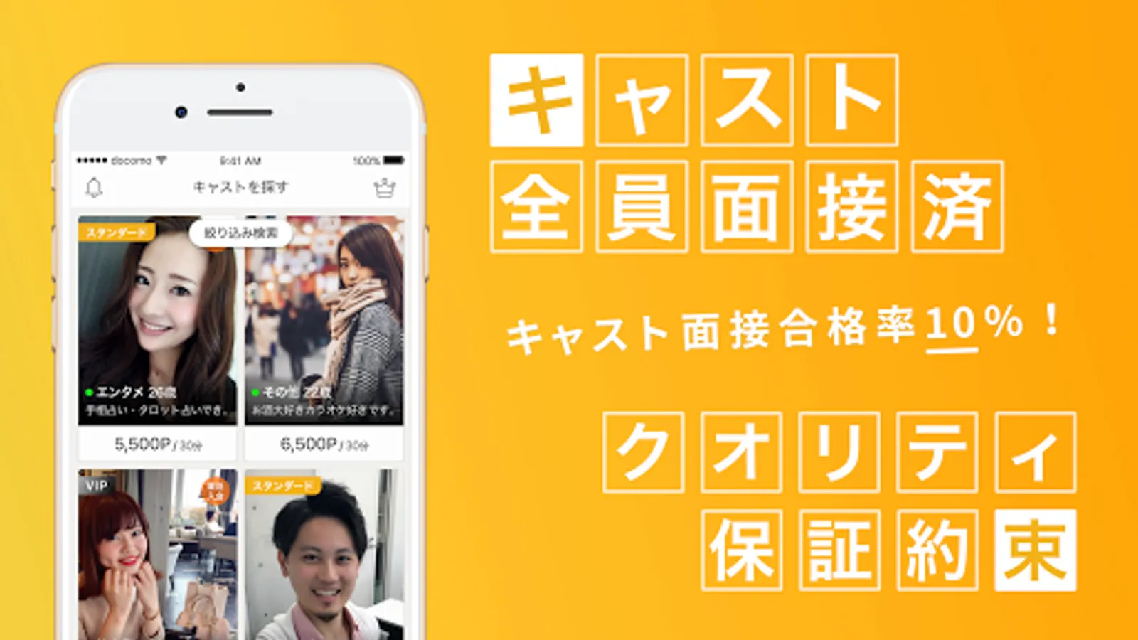 キャスト登録者は全員面接済みだから安心。一般人から、芸能人、占い師や漫才師まで。